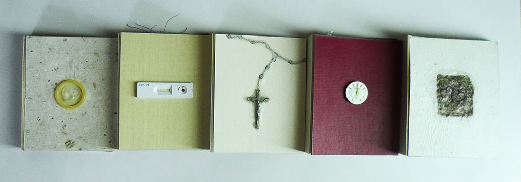 This book has stuck a broken locket on its cover. Inside in the right part inside is stuck a photo of the artist as a child. She is covered by a piece of cloth from a personal clothing of the artist. At the top a strip of cloth contains a religious prayer from the Mother of Charity. On the left are three pills that are consumed daily by people with HIV.