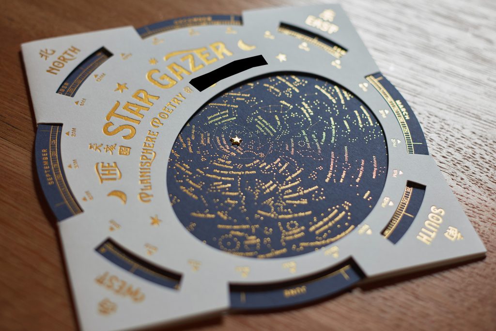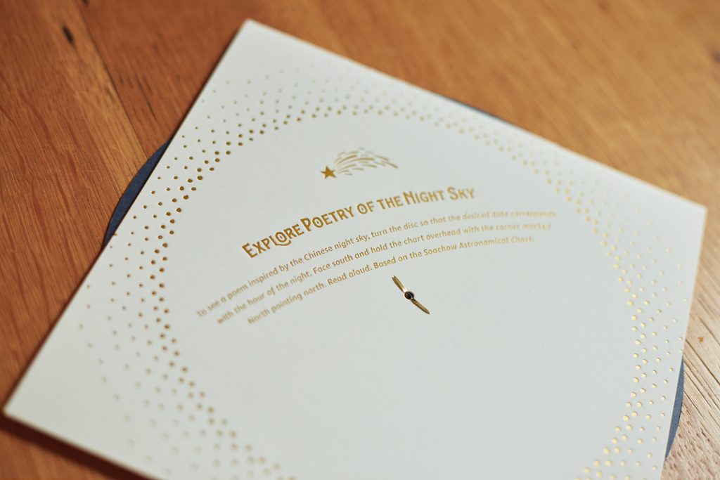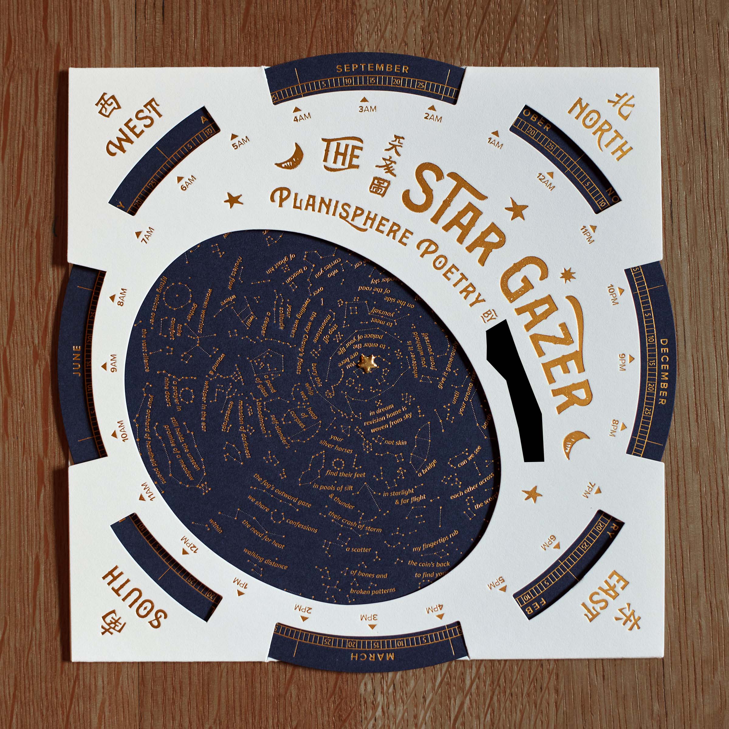 Based on the Soochow Astronomical Chart of 1193, The Star Gazer offers unique poetry depending on the day and hour, designed as a planisphere depicting the Chinese night sky as seen from the northern hemisphere. To view the stars, turn the disc to align the desired date with the hour of night. Face south and hold the planisphere overhead with the corner marked North facing north. The map will reveal a celestial poem that awaits you among the asterisms. Readers become collaborators who are invited to let their eyes wander and make lyrical connections that feel most natural to them as they read the sky aloud to someone dear.