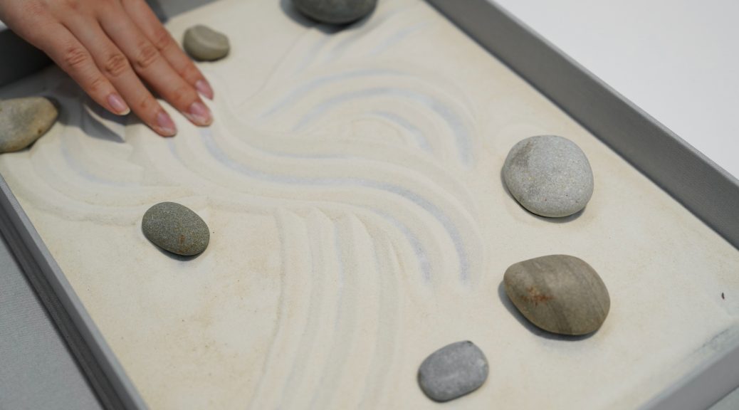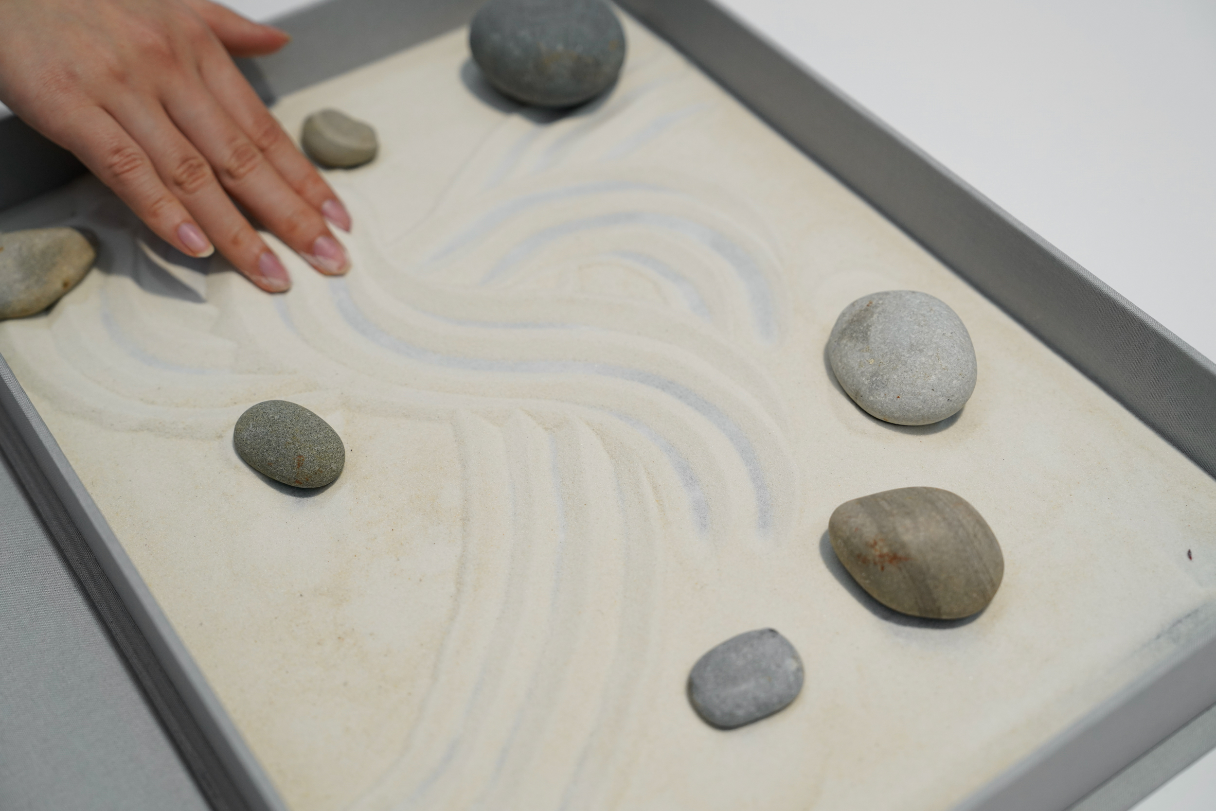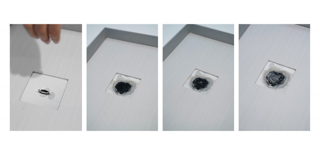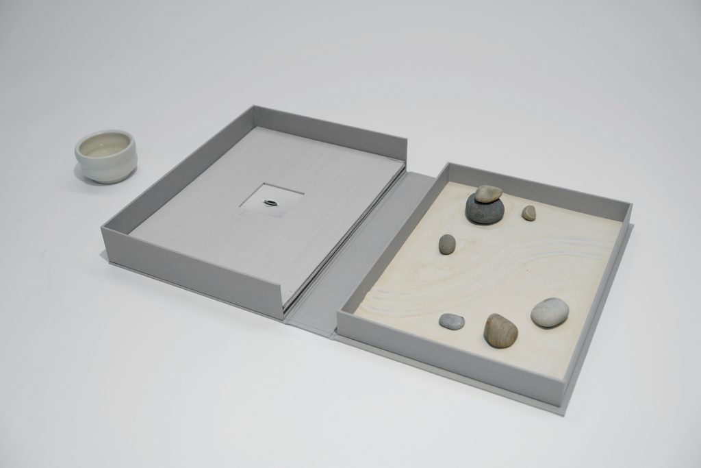 When I returned to Chicago, I decided to share this rejuvenating experience through Meet me at your fingertips, an interactive artist book in which viewers are invited to participate in a meditative and playful exchange with a Zen garden by raking water patterns on sand and rearranging stones with their fingers (both components were collected from a beach in Saugatuck). They can then rinse off their sandy fingers in a bowl of water, before dripping the water residues on a water-soluble image of a bubble that would eventually dissolve to reveal ripples. The subsequent acts of destroying and revealing in the two steps would thus reflect my transgression of a curious and tender exploration of the forbidden realm of water. The exterior of the clamshell box shows one continuous pattern, carved into the book board, that runs from the back cover through the spine to the front cover. Referencing the raking patterns in Zen gardens, it symbolizes a stream of water to suggest a continuous flow as my prompt to viewers to participate in the raking with their fingers on the inside.