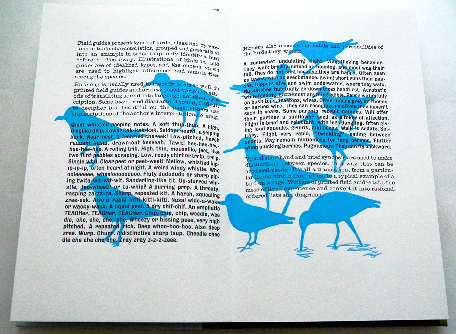 The book also includes information about the current role of the field guide, and other speculative information about birds books, extinction, and the history of birding. This spread talks about the kinds of printed language specific to printed guides: silhouettes to help beginners to recognize different species; transcriptions of sound to written language to describe birdsong; generalizations about the behavior of different species. I am interested in what is lost in the transition from paper reference book to multimedia application, and what kinds of visual and verbal language were specifically invented for the printed format.