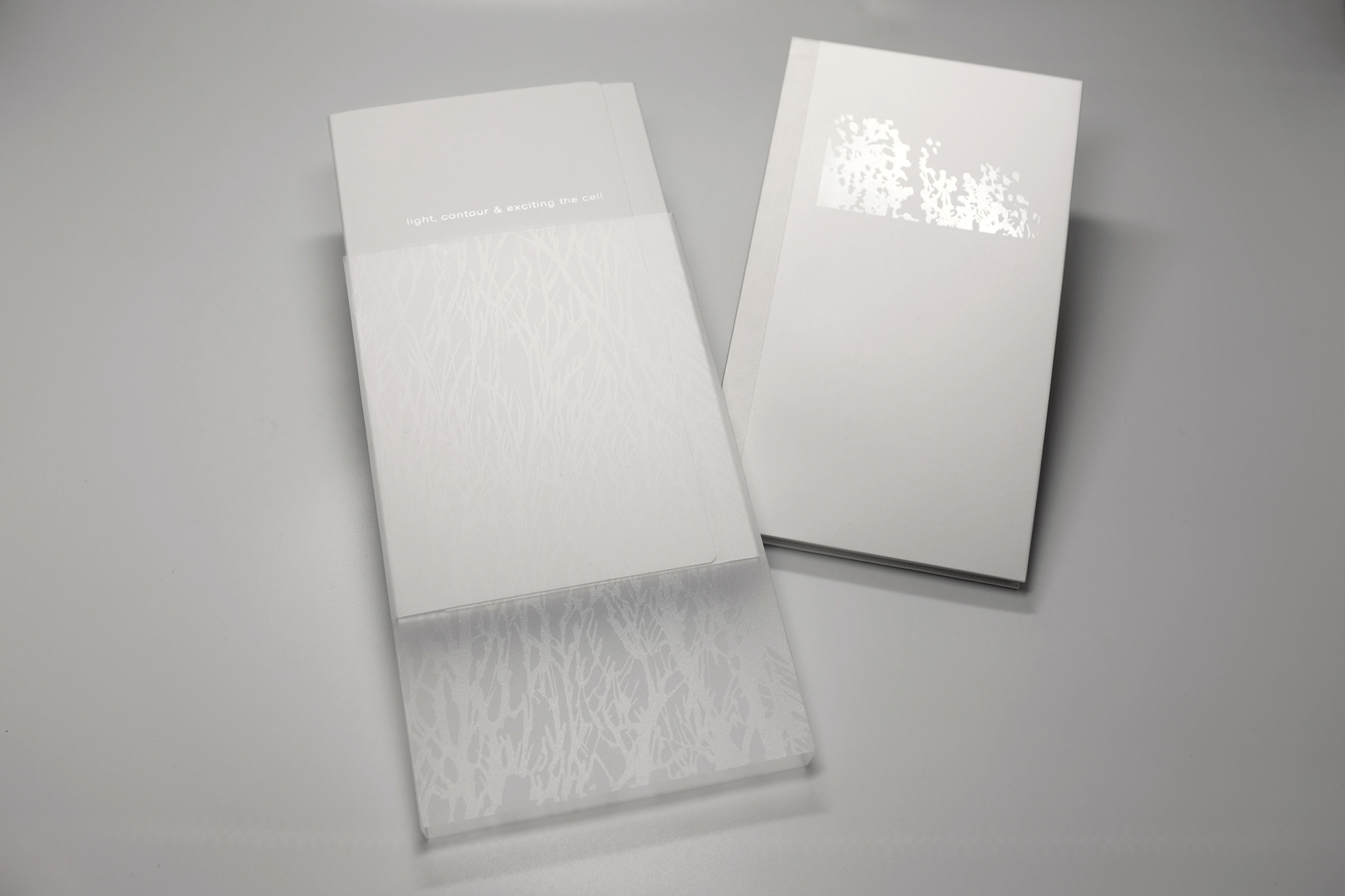 Additional subtle materials, which may be overlooked, are used to engage the senses and chance attention — a translucent slipcase is printed with clear varnish that may only be visible at particular light angles; and white peach-fuzz-textured phase folder and book covers add a tactile quality that will easily mar and record