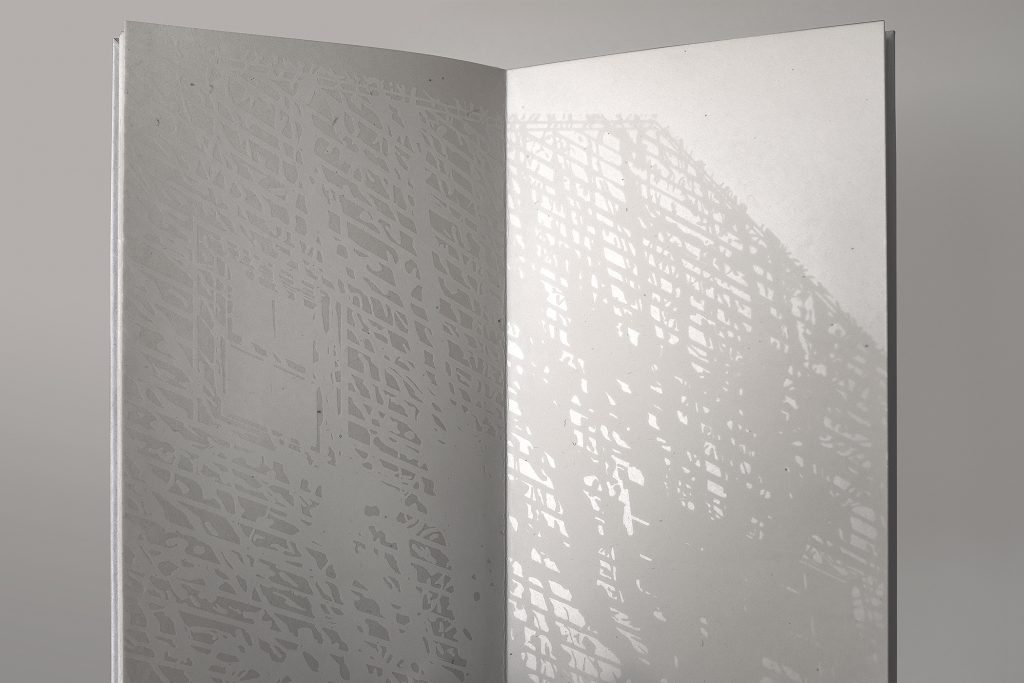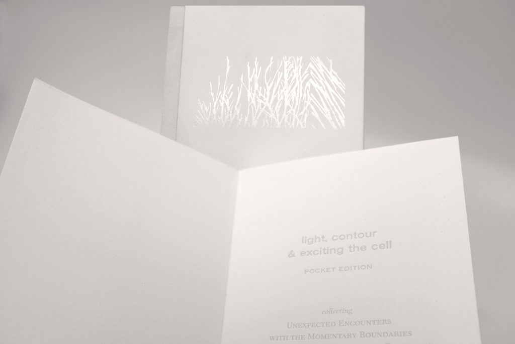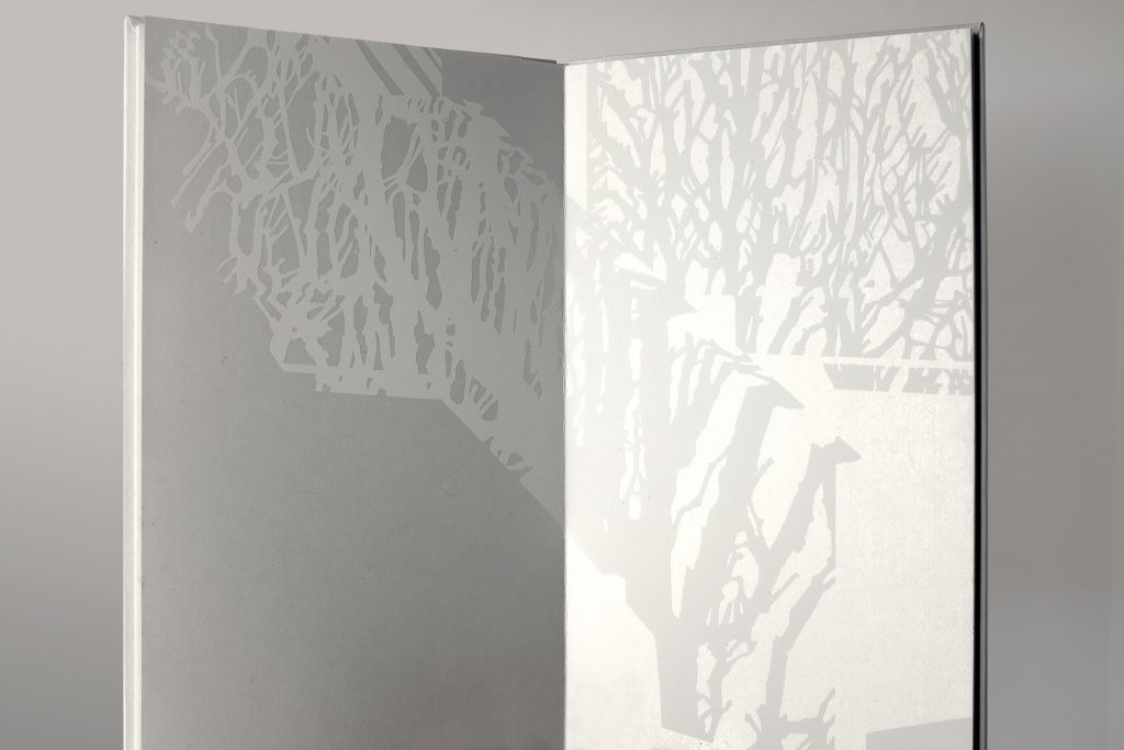 screen printed on reflective gampi to create tonal inversions that highlight the flipping of the senses and moments of materialization. As the pages turn, shadowy forms become light, and white objects turn to shadow.