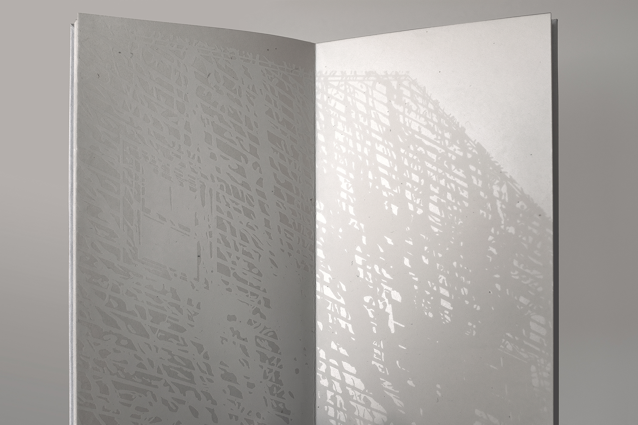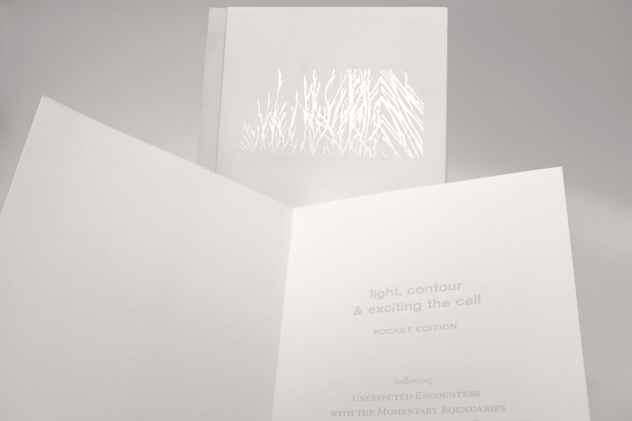 Screen-print, letterpress and foil stamp on Japanese Surface Gampi and peach-fuzz textured Curious Touch paper. Drum Leaf binding with a duplexed phase folder and translucent slipcase.