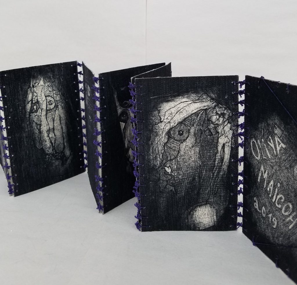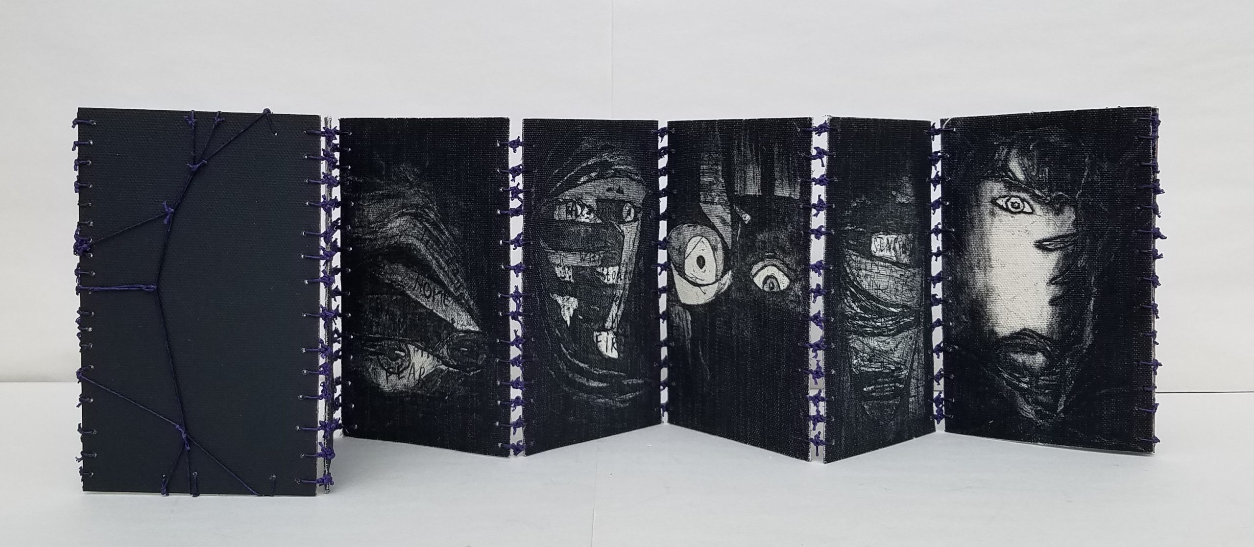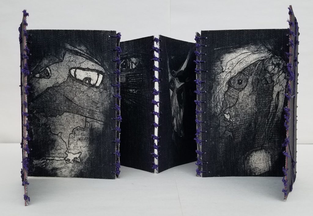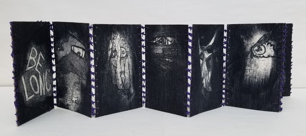 Belong, Be Long is a Leporello structured book which consists of etchings printed on raw canvas, and bound by linen thread tied in knots.