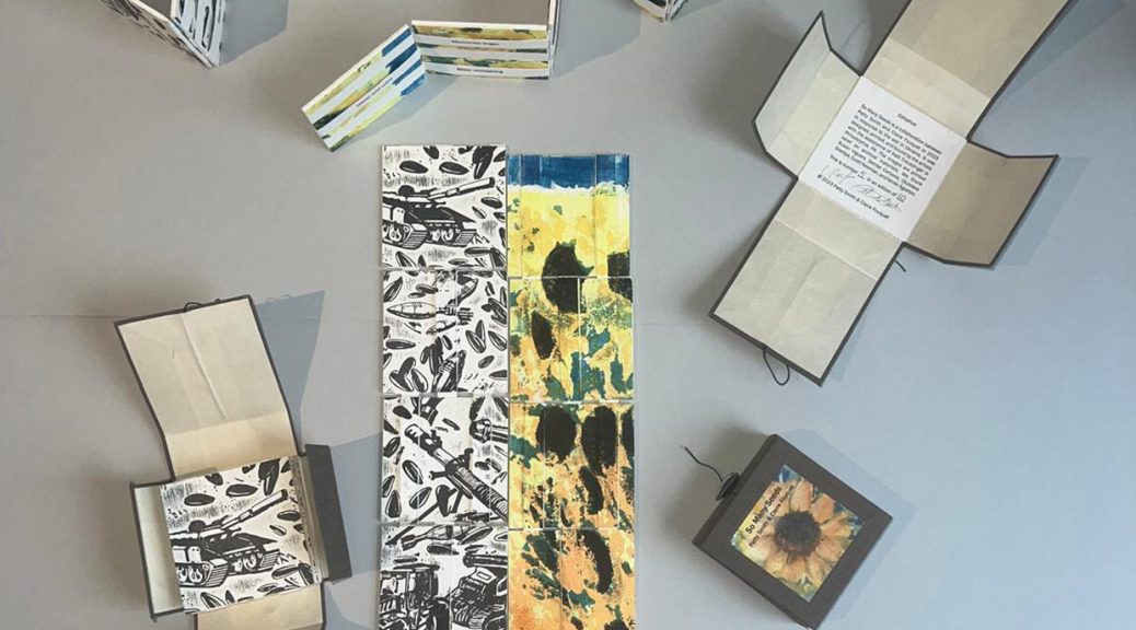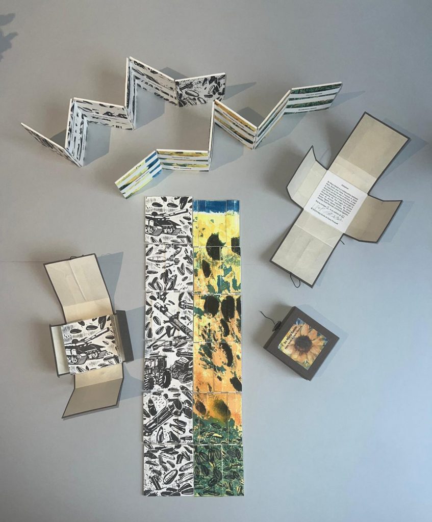 Created in 2023, the book/object, So Many Seeds by Patty Smith and Claire Fouquet addresses the war in Ukraine through image, text and, structure. Upon opening the enclosure the viewer finds an original water color by Fouquet, of a sunflower, Ukraine’s national flower. When one removes the Jacob’s ladder from its box, two sides can be seen. The black and white images are of weapons of war intermingled with sunflower seeds. The color images are of sunflowers in bloom. The sunflower has long been an important part of the Ukrainian and global economy, as well as a symbol of peace. Since the war, beginning in 2022, it has taken on greater meaning, representing resistance, unity and hope and used internationally as a display of support for Ukraine.