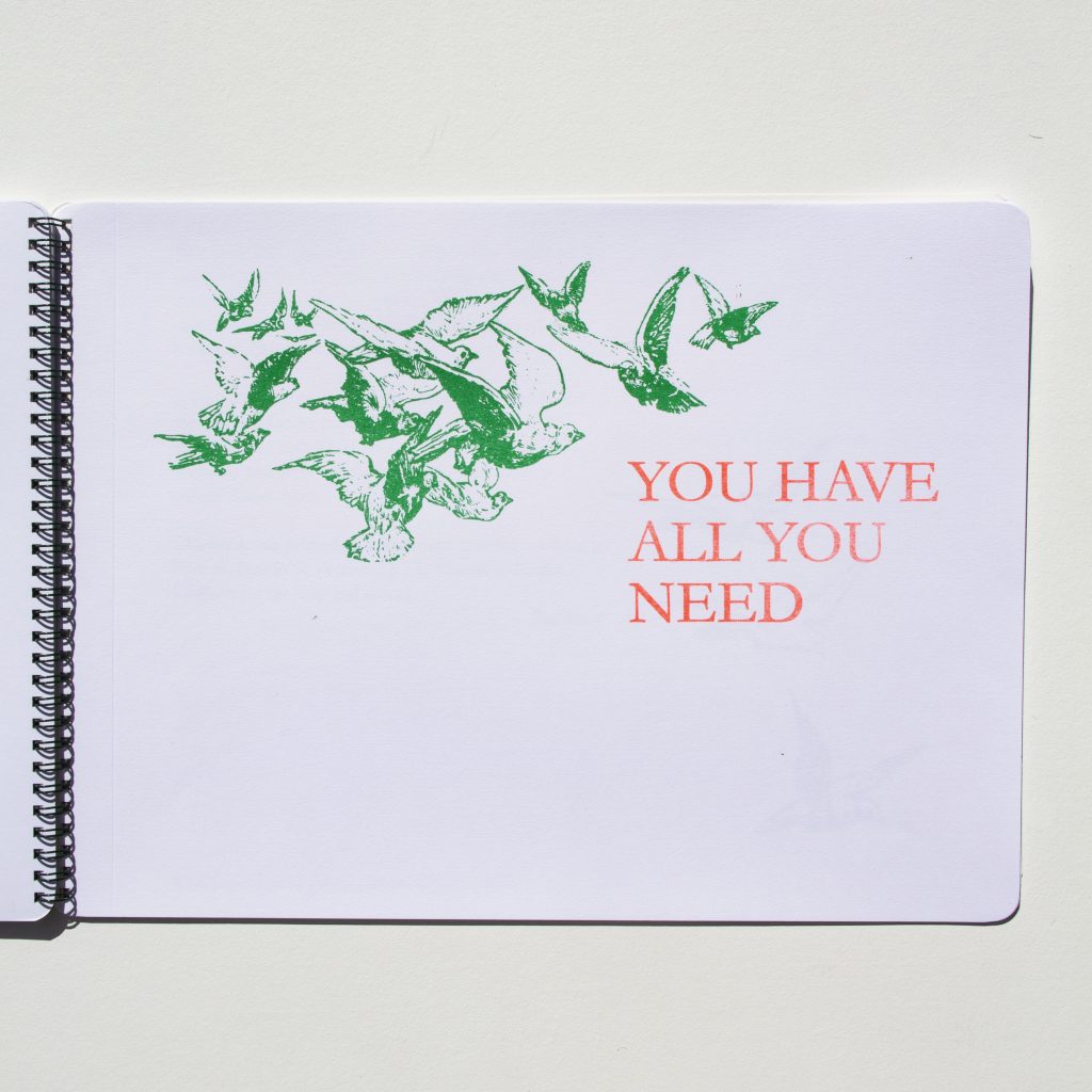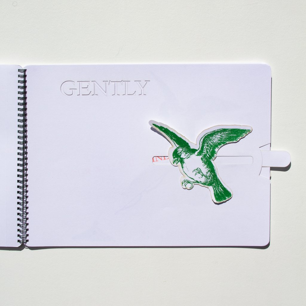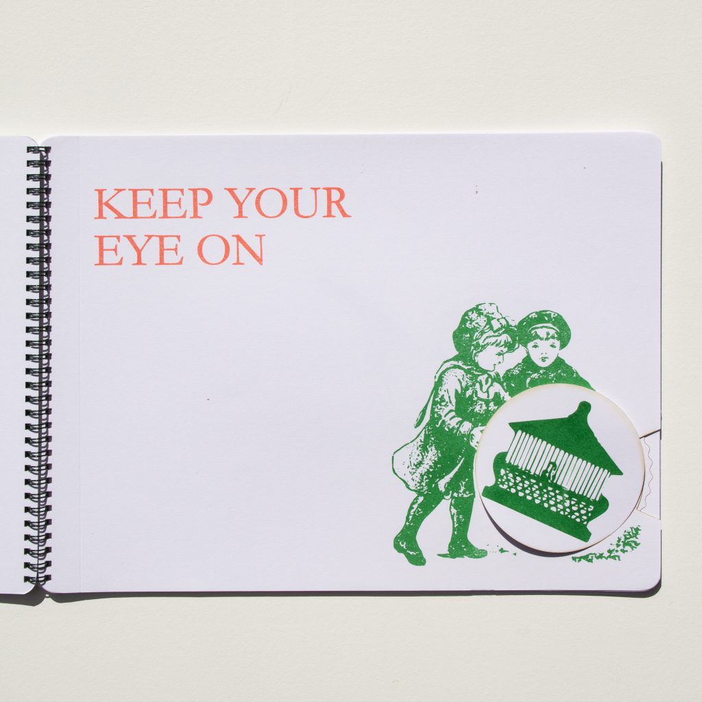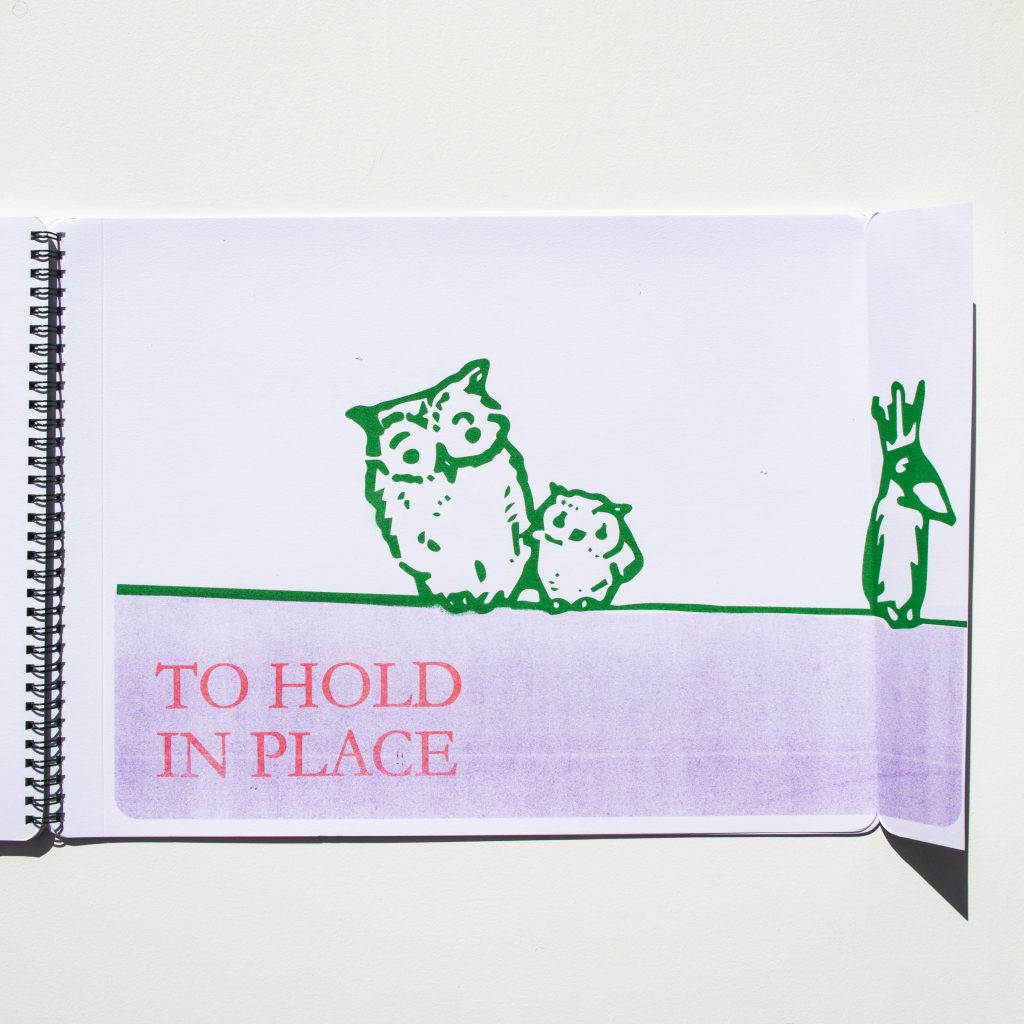 To Hold In Place is a children’s book for adults that uses images and instructional text found in movable books in the Baldwin Library of Historical Children’s Literature collection to form a story of birds setting themselves free. It includes movable elements, cut outs, and sliding mechanisms. It was inspired by and incorporates elements from materials in the collection such as coloring books, story books, game books, and popup books from Lothar Meggendorfer, and Dean and Sons publishing firm among others. In the spirit of the movable books in the collection, all the mechanical elements are exposed and visible to the reader. The book was created using a Risograph printing machine which is typically used for zines, and combining that with a laser cutter to create a fine art book.