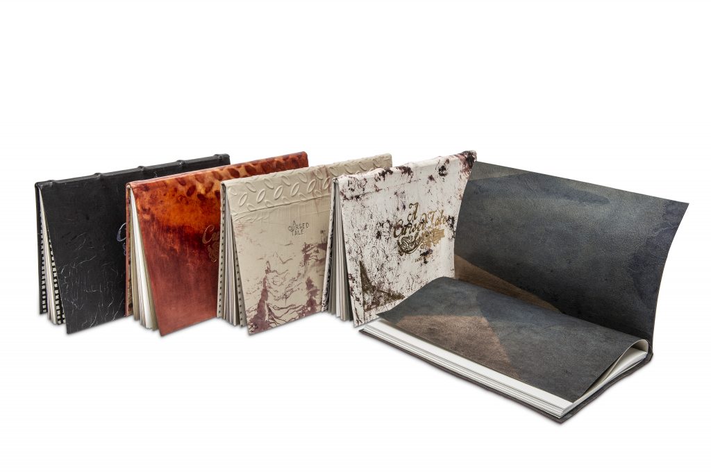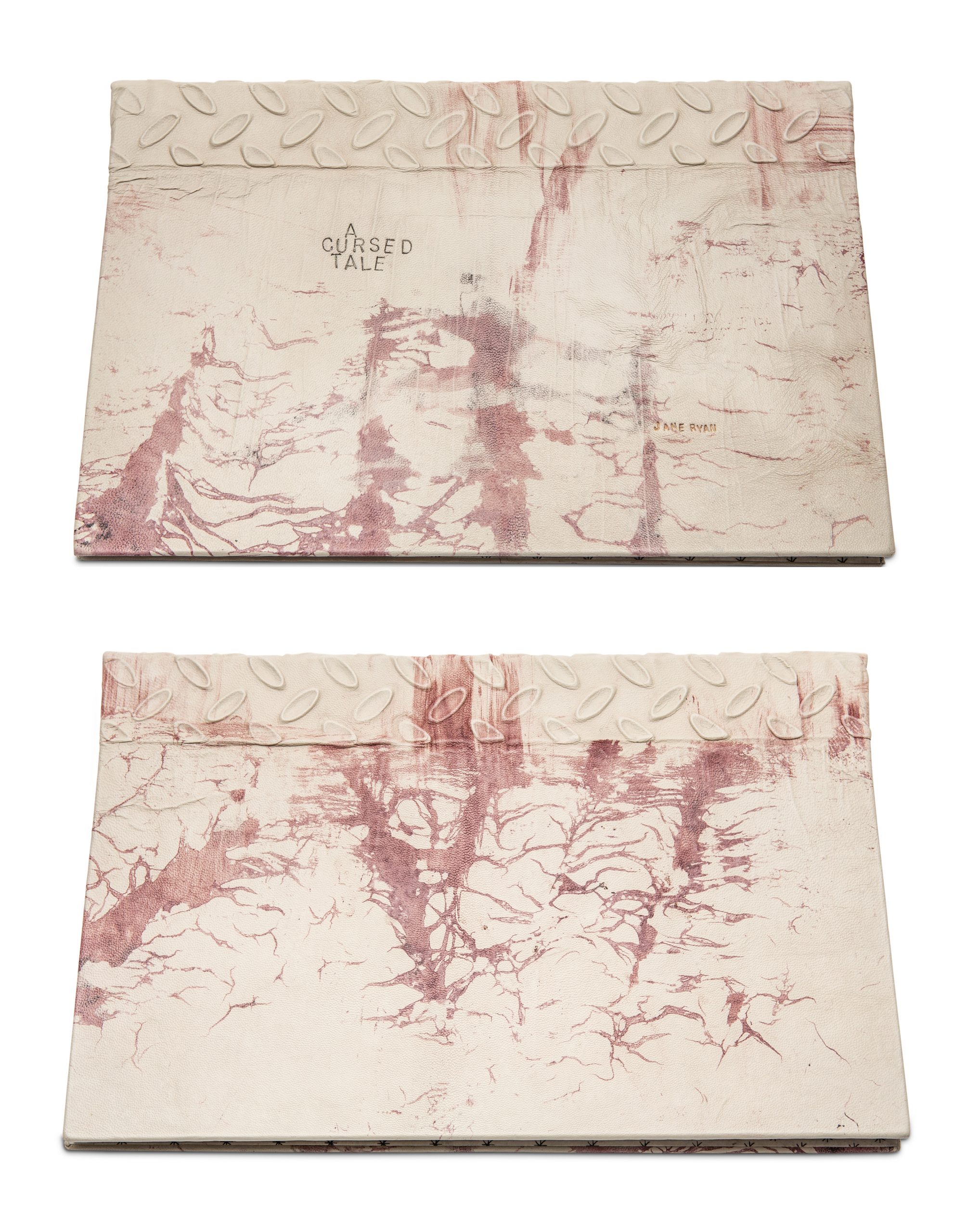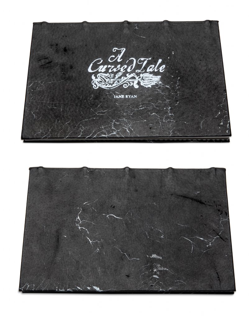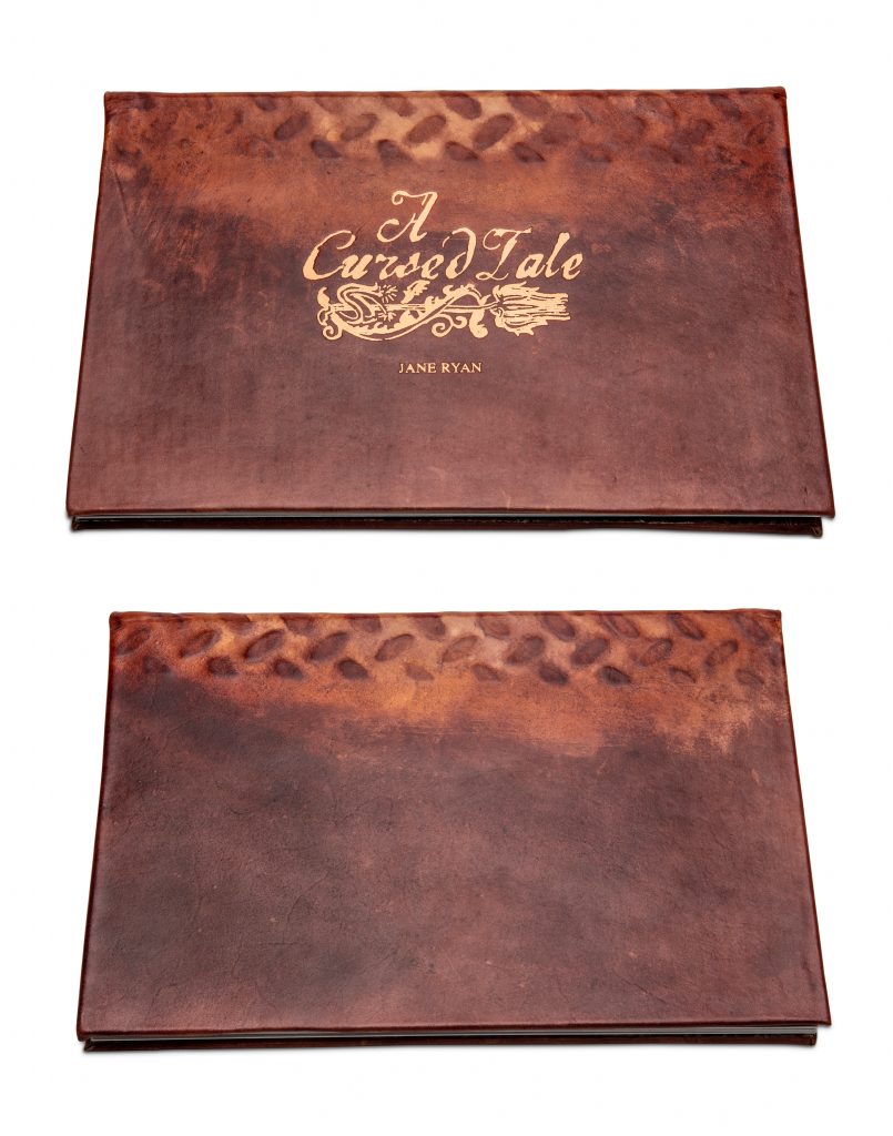 Theresa: When Jane’s search for a book artist to produce her illustrated story, A Cursed Tale, landed with me, I was thrilled! The nature of the work as well as the timing were exactly what I needed to float me out of a creative dive. The content Jane provided was beautiful and familiar; perfect text for coursework I had recently planned at the American Academy of Bookbinding. During the autumn months of 2021 I began experimenting with various leather treatments adding color, texture and design – an endless experiment, without a doubt! During AAB classes I produced two 6 x 9” prototypes to give Jane, the writer/illustrator, options. Her response to the initial two books formed a framework for me to create five larger fine bindings laced onto boards with sewn in silk headbands – each with the feel of our Iron Range hometown graveyard.