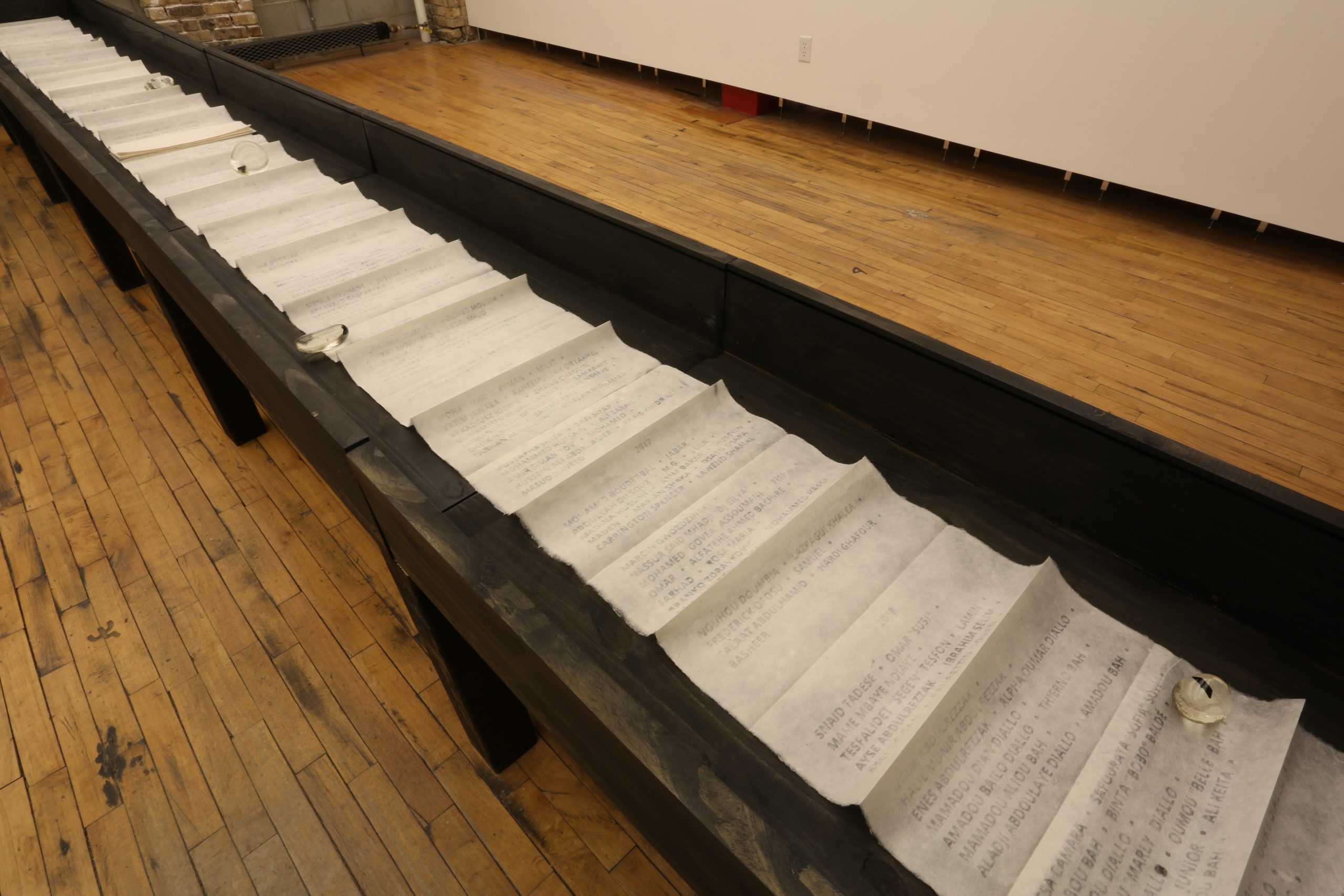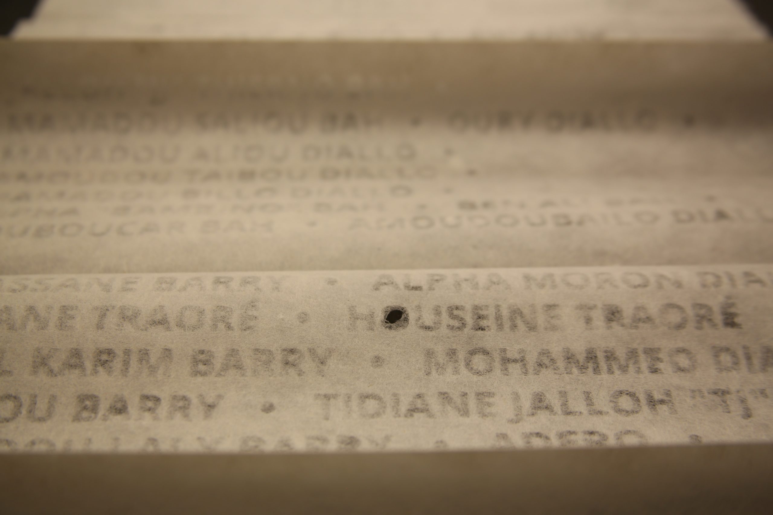 We gathered names from the UNITED list and formed a memorial of names with the negative space of fragile handmade paper. In this technique, called watermark, you read what is not there. Similar to the watermark, the lives lost form a mark on humanity. If humanity is a one whole piece of paper, every letter of every name makes a hole on it.