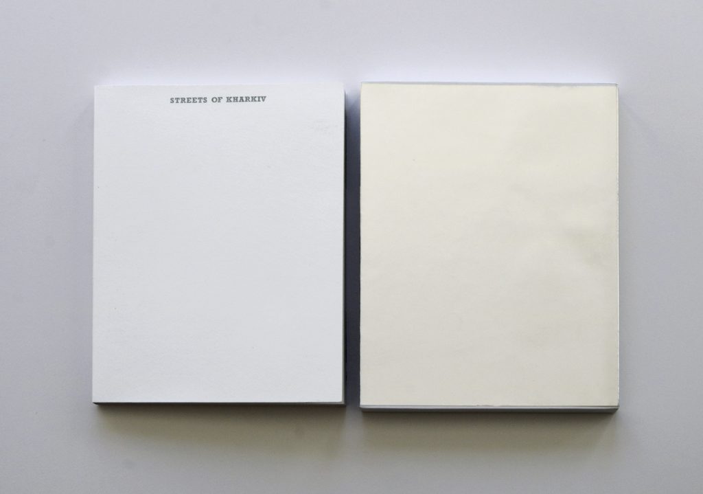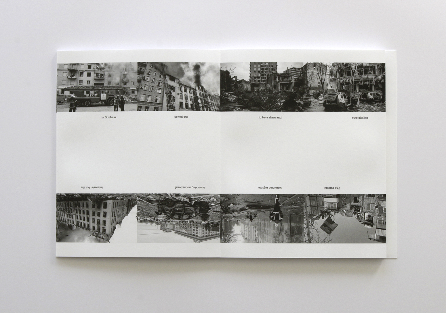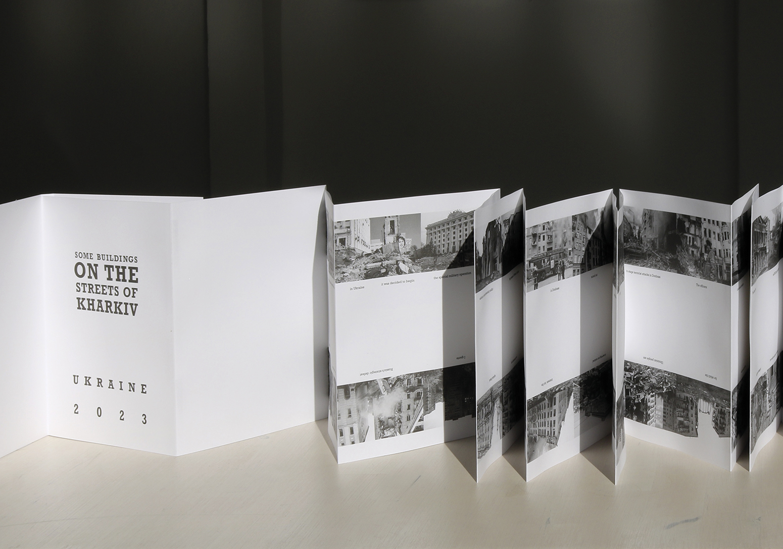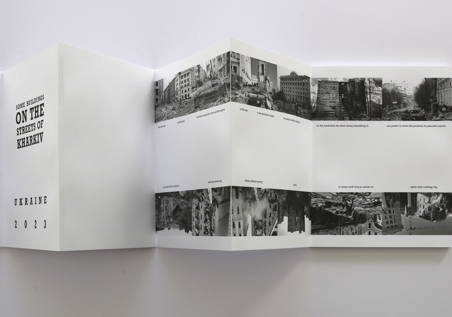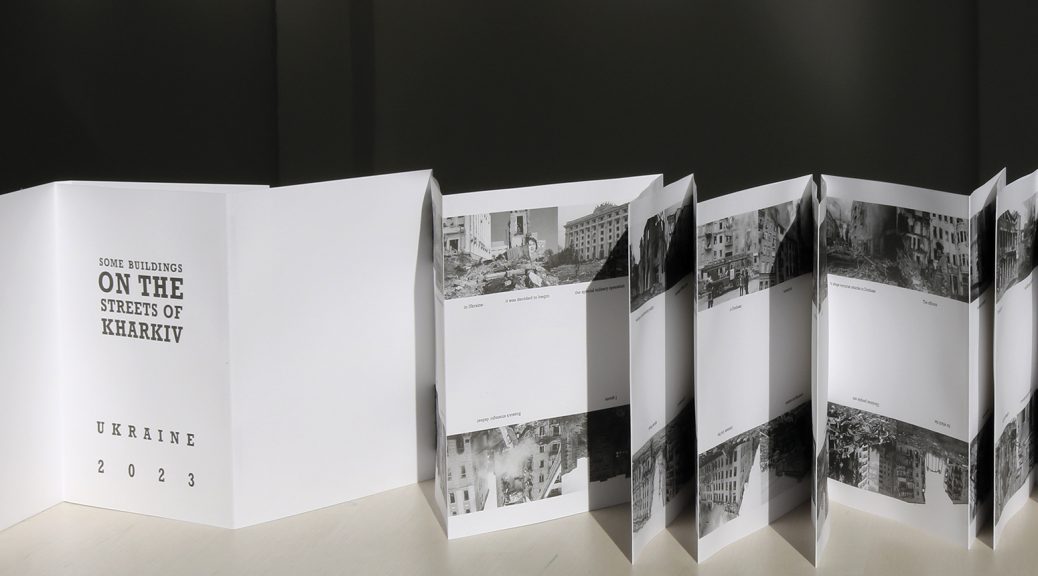Ed Ruscha’s iconic artist’s book EVERY BUILDING ON THE SUNSET STRIP from 1966 is today considered a precursor to conceptual artists’ books; it is viewed in the context of Duchamps’ ready-mades and Warhol’s serial works, and it is a sought-after collector’s item. Ruscha’s concertina has inspired a number of new versions. My intention was to use the external form of the famous artist’s book with completely different content. SOME BUILDINGS ON THE STREETS OF KHARKIV shows images of buildings in the Ukrainian city of Kharkiv that have been damaged or destroyed by Russian attacks. While Ruscha’s book places house numbers under the photographs, I used excerpts from the English translation of a presidential address by Vladimir Putin that he gave on February 21, 2023 (taken from the Kremlin website). As in earlier speeches, he blames the West and NATO for the war in Ukraine.