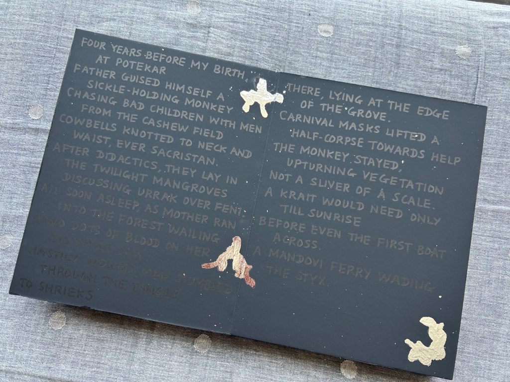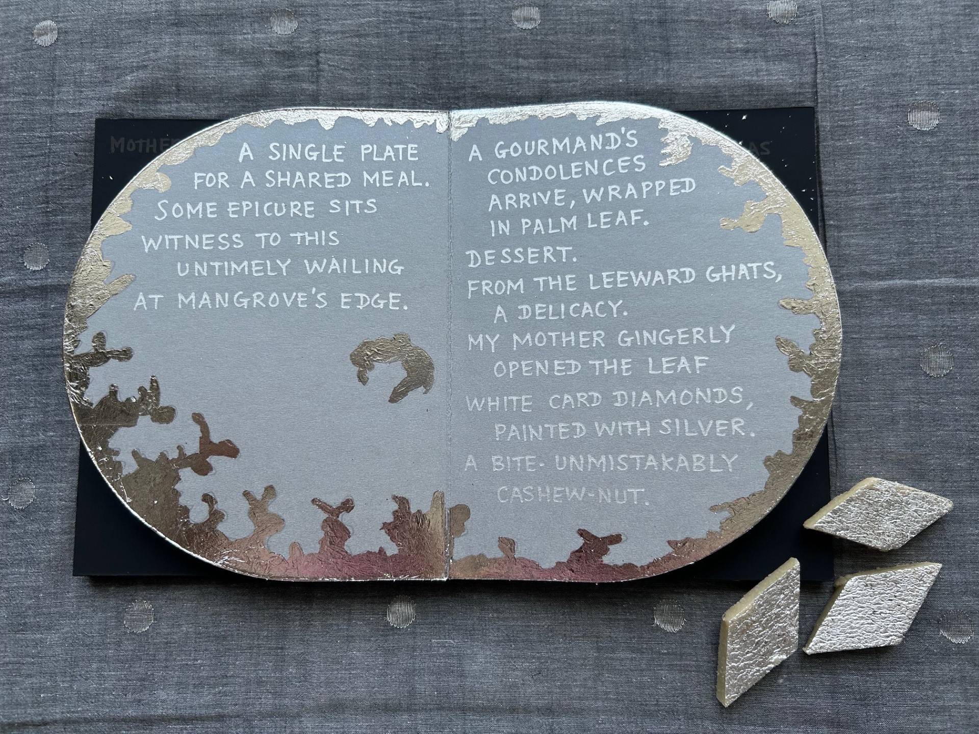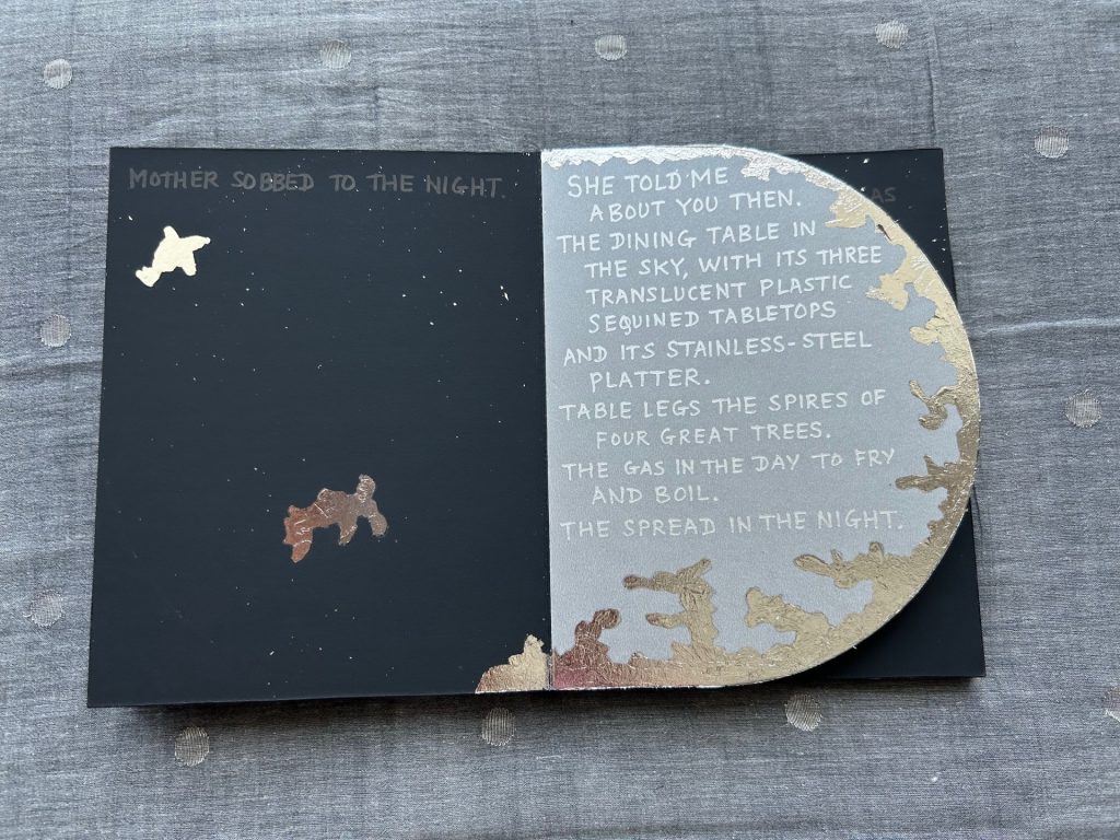 The silvery effect of the moon was created using Waraq – an edible avatar of silver, beaten into fragile sheets, traditionally smeared on Indian sweets. This craft is mainly practiced by the Pannigars, a community originally hailing from Afghanistan, but settled for generations in Jaipur, Rajasthan India. For ‘Moon’, Waraq was sourced from an original Pannigar family who gave me the material and also taught me how to use it on the book.