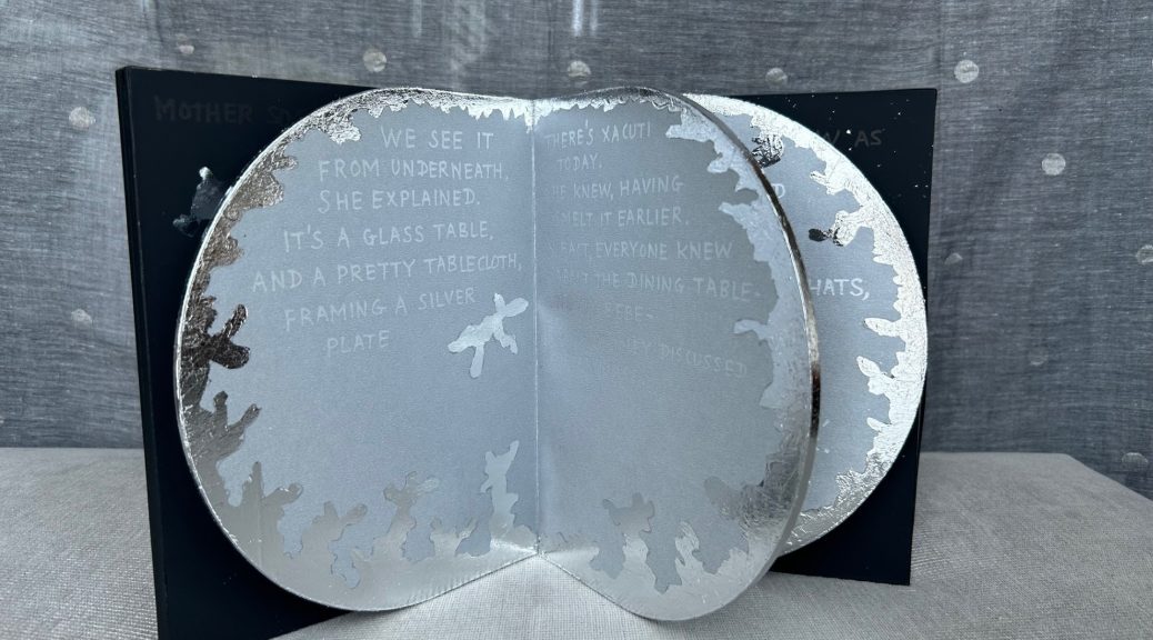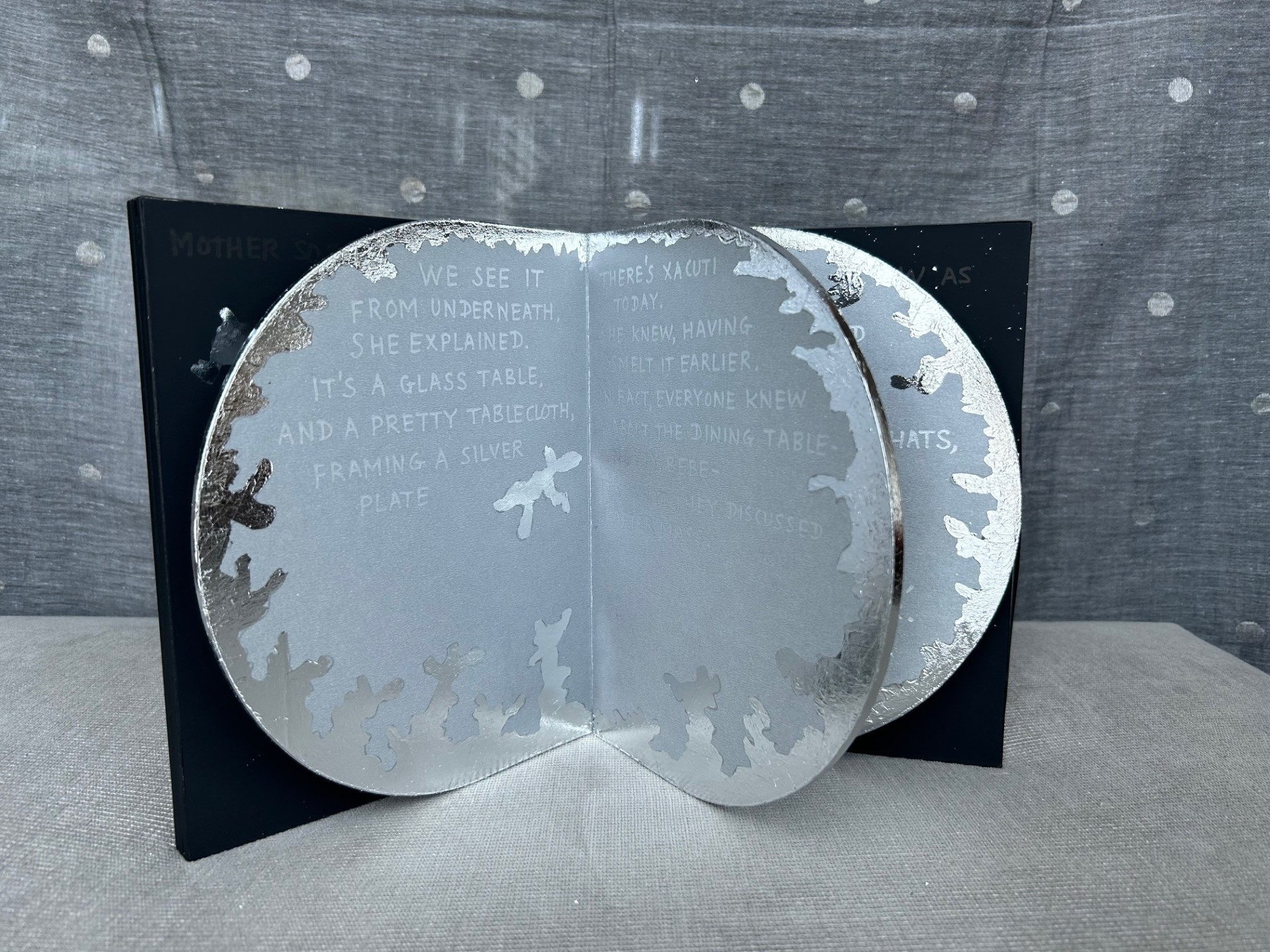 A joint mother-son collaboration resulted in a book with three sections. Two parts black – night, one part silver – moon. Black text on black pages, silver text on silver pages, hidden, unhidden like the moon in the cloudy night sky… like the moon in the book.