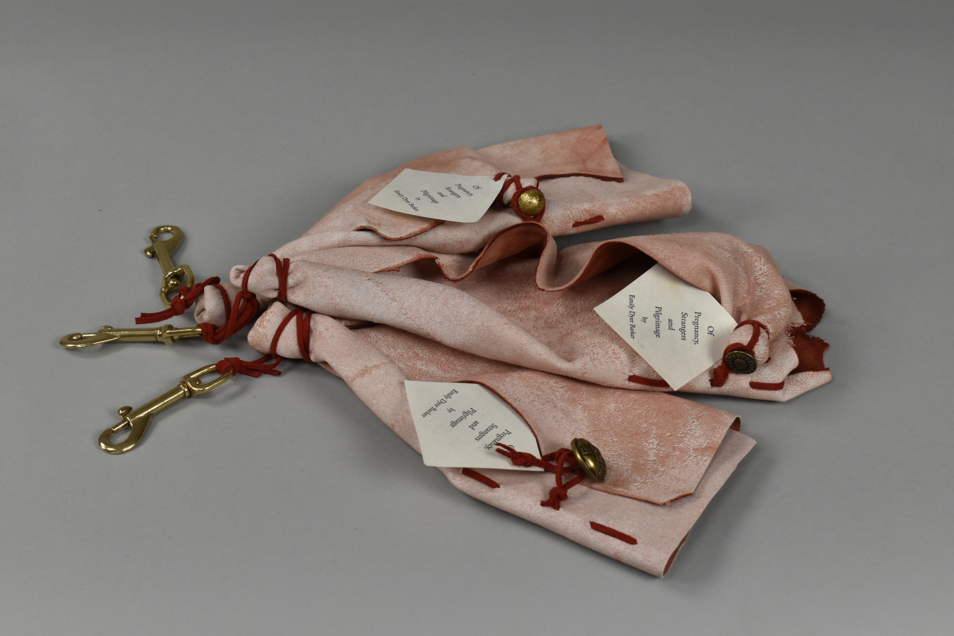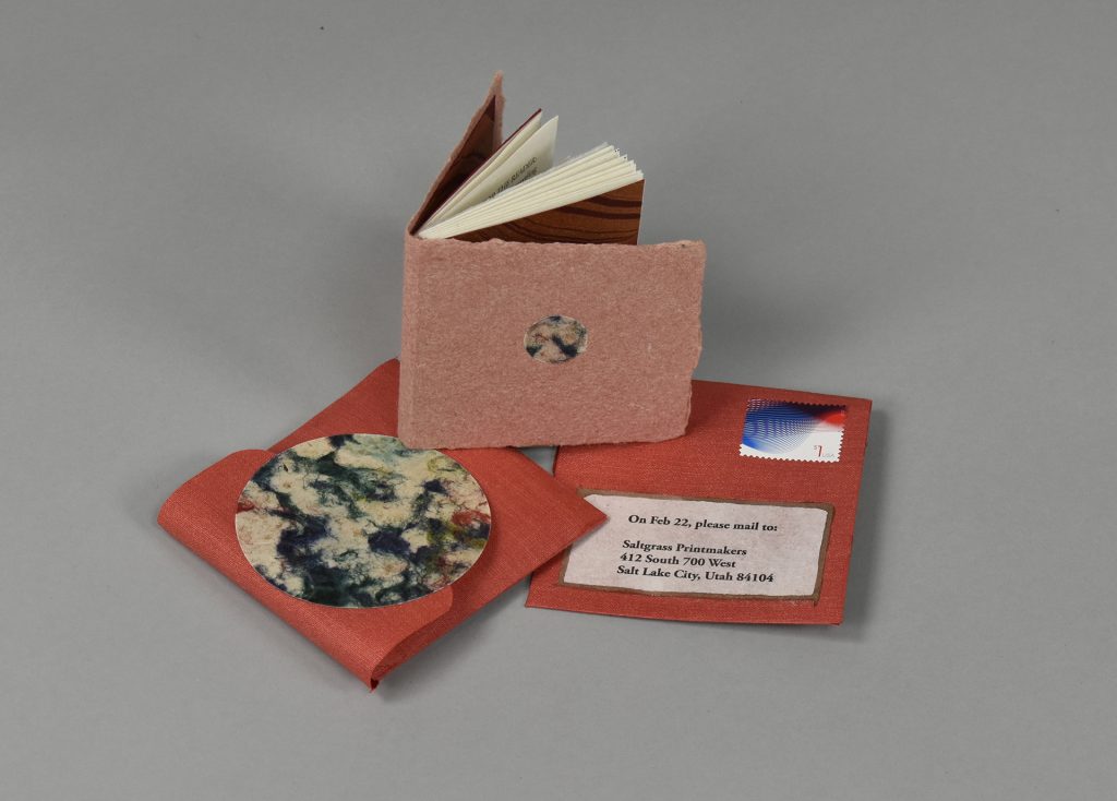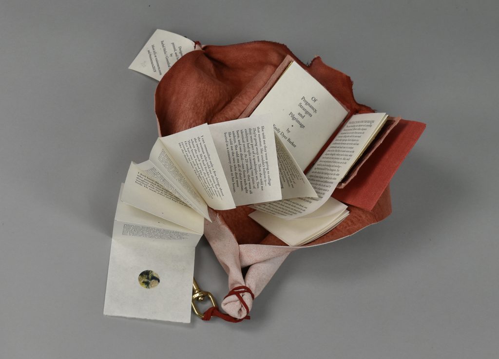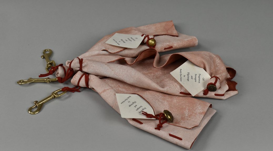 I think of Emily Dyer Barker’s Of Pregnancy, Strangers, and Pilgrimage as a public art and collaborative piece on many levels. I created it in response to a curator and author, in conjunction with other artists making their own chapters, and, like the other artists, allowed it to be completed by the readers—entrusting it freely to unknown travelers—a metaphor for what it means to be a writer or artist (or mother). Only a couple of the copies of my book that toured the country made it to Salt Lake City, which suggests that some of the strangers kept their copies, or the inner envelopes, once detached, got lost in the mail, being very small. Even this loss completes the metaphors present in the author’s text and my binding. Plus, I built extra books into the edition for exhibition. The books come stamped and addressed, as if they could still be mailed to their final-destination, which, as with all books and beings, can never be known.