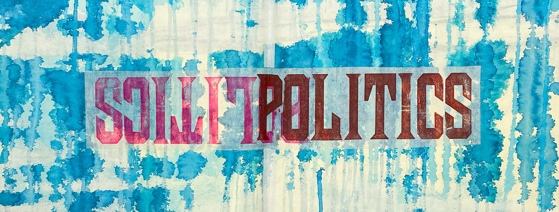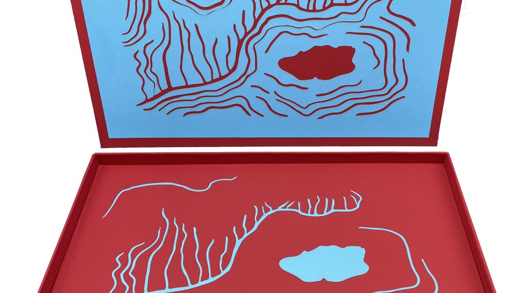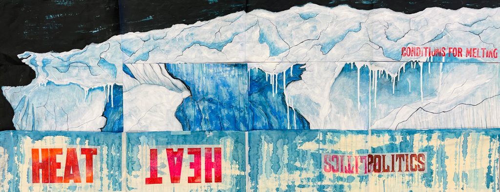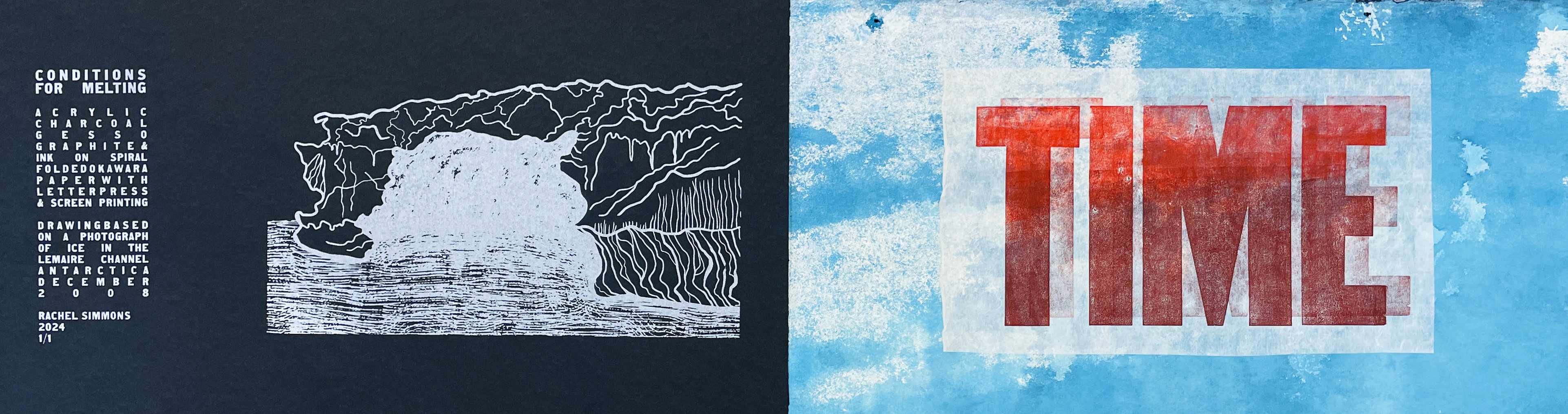Conditions for Melting is an artist’s book made from a large mixed media drawing of an iceberg I photographed in the Antarctic peninsula. I cut and folded the drawing into a single sheet spiral book structure, then added letterpress-printed words to the reverse side where layers of turquoise ink have bled through in textured drips and splotches. Using a barren and spoon to pull impressions from wood type, I printed text identifying environmental and social pressures that provide perfect conditions for melting glacial ice. The text suggests that racism, tyranny and apathy are as much to blame for climate change as natural physical forces such as heat, pressure and time. A color palette of contrasting warm and cool colors point to the often oppositional relationship humans have with nature, while the tactile nature of the enclosure’s design and the long, crinkly pages of the book evoke personal memories of hiking through deep snow in Antarctica.