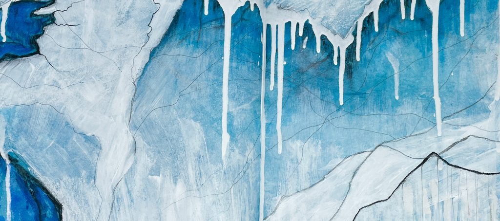 The book’s fragmented spiral-folded structure embodies the perception of climate change as a hyper-object, a complex set of systems and forces too vast for humans to comprehend or even see all at once. The colophon illustration offers a preview of the large scale ice drawing, which can only be seen at one time by completely unfolding the book. When folded, the book can be read in multiple directions—front to back, back to front and top to bottom— allowing the reader to create unique sequences of text and image.