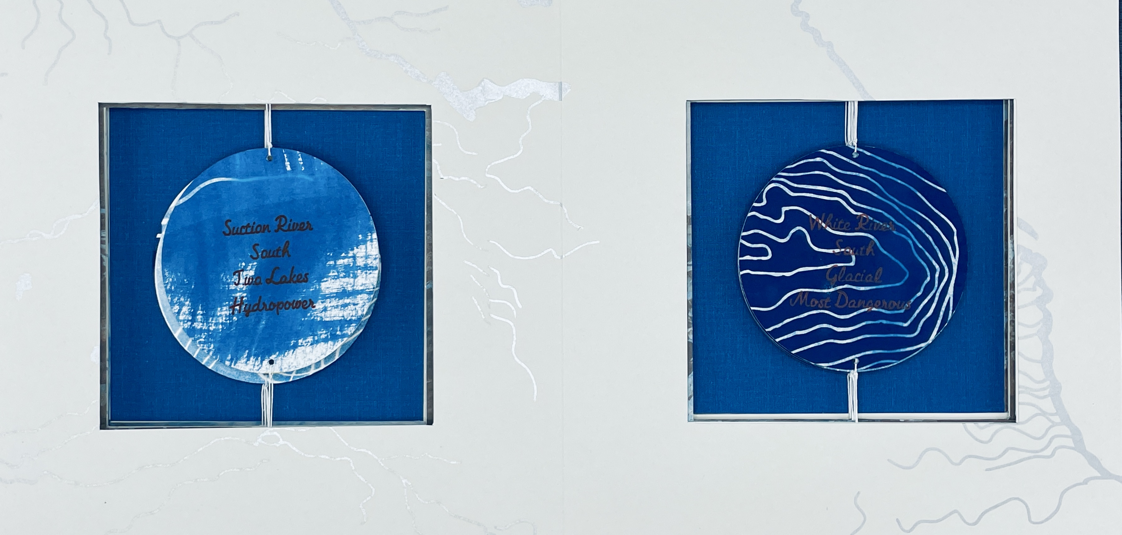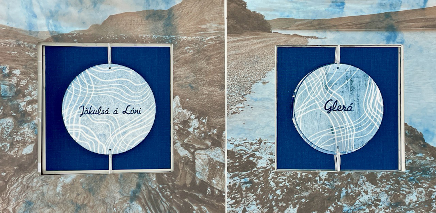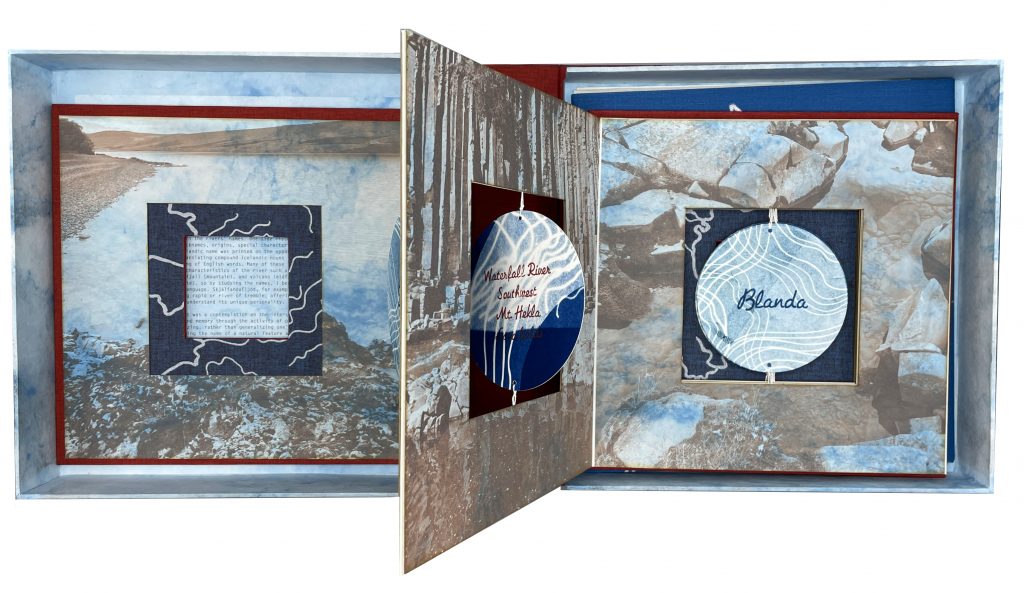 This project was a contemplation on the intersection of language, culture, landscape and memory through the activity of placemaking, which relies on individualizing, rather than generalizing one’s connection with a physical place. Knowing the name of a natural feature and the origin of its name is an important part of internalizing one’s recognition of the landscape. Never having had an eidetic memory, I’ve always relied on my experiences and interest in language to remember a place, especially one as fluid and ever-changing as a river, ocean or lake. It’s important to me to understand why the river is milky or clear, wide or narrow, calm or rapid. The materials in the book represent the colors of the rivers I saw in Eastern Iceland. The variations of blue, milky white and brown identify the origins of the rivers—whether from glaciers, volcanoes, springs or mountains—and reflect the way in which river names are the result of a particular combination of geography, gravity, geology, time and cultural significance.