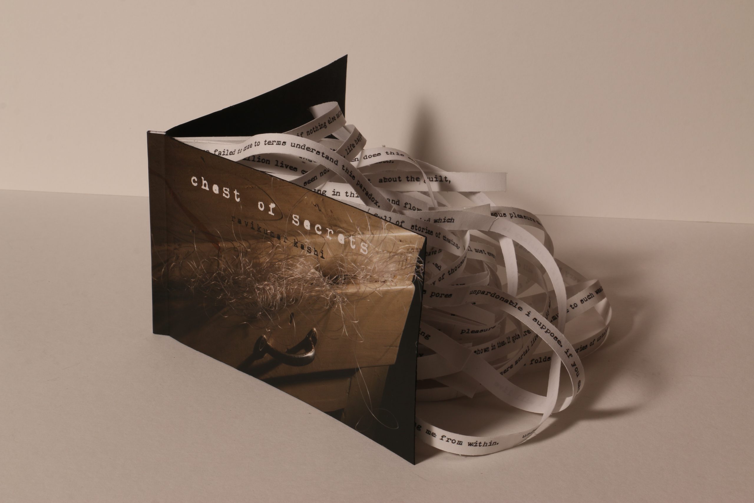 What we reveal to the outside world is a largely filtered version of ourselves . Our inner world is convoluted, complex, and chaotic. “Chest of secrets” is a book that gives a visual form to these intertwined narratives that fill our mind, to the way it is difficult to find the beginning or the end of a thought. One thought leads, merges into another, and keeps circling back around hope, desire, doubt, fear, regrets, guilt and secrets. While “Chest of Secrets” can be read in bits and pieces, it is mostly intended to be seen as a visual metaphor for the illegible inner world.