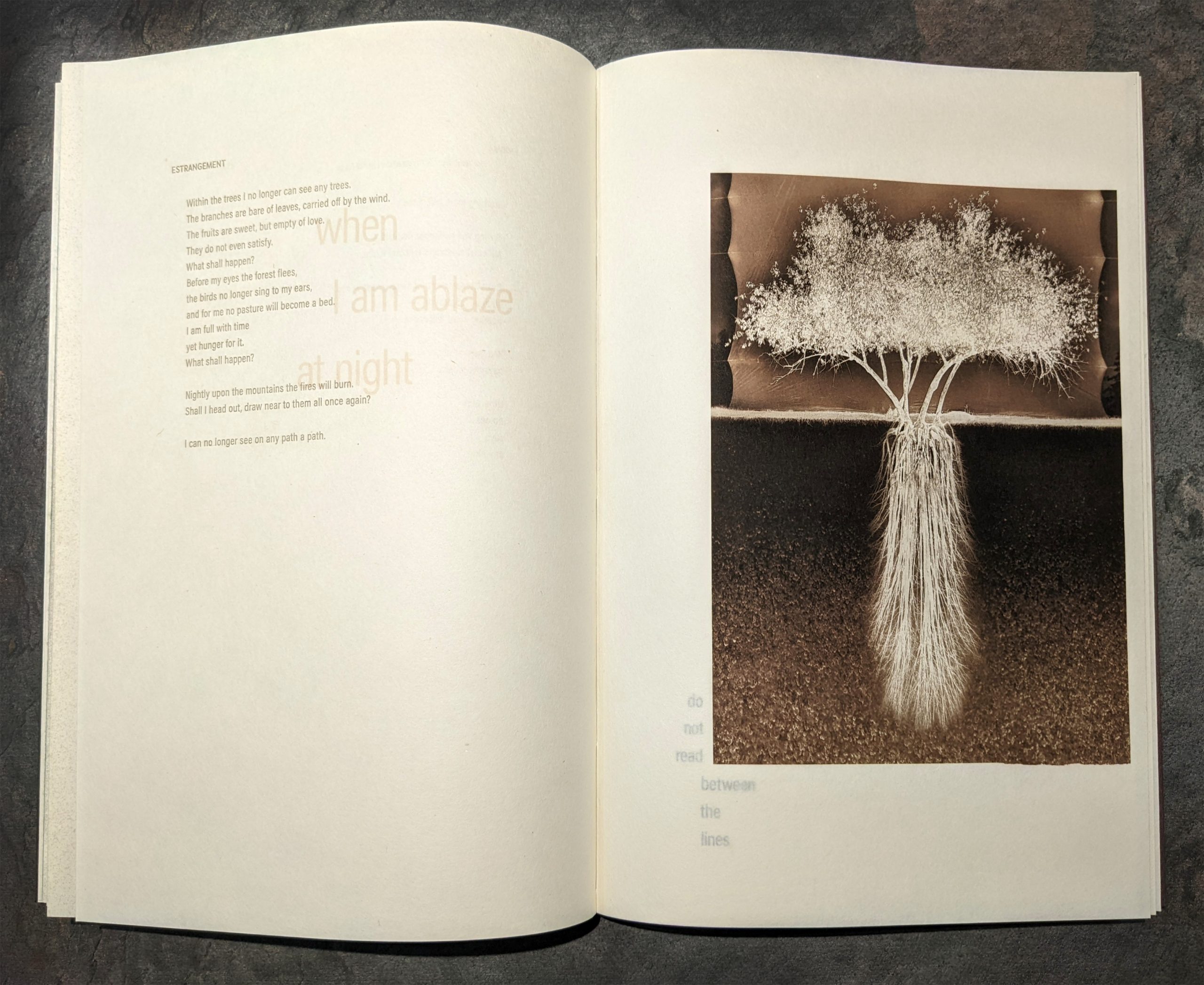 In making a book, I attempt to convey the mind of the writer. This is a practice conducted through design choices that evolve with experimentation. Integrating typography, images, materials, and structure is an exercise in respect and discovery that, if conducted successfully, amplify the writer’s intent and prove the book maker’s concept to be harmonious and compelling.