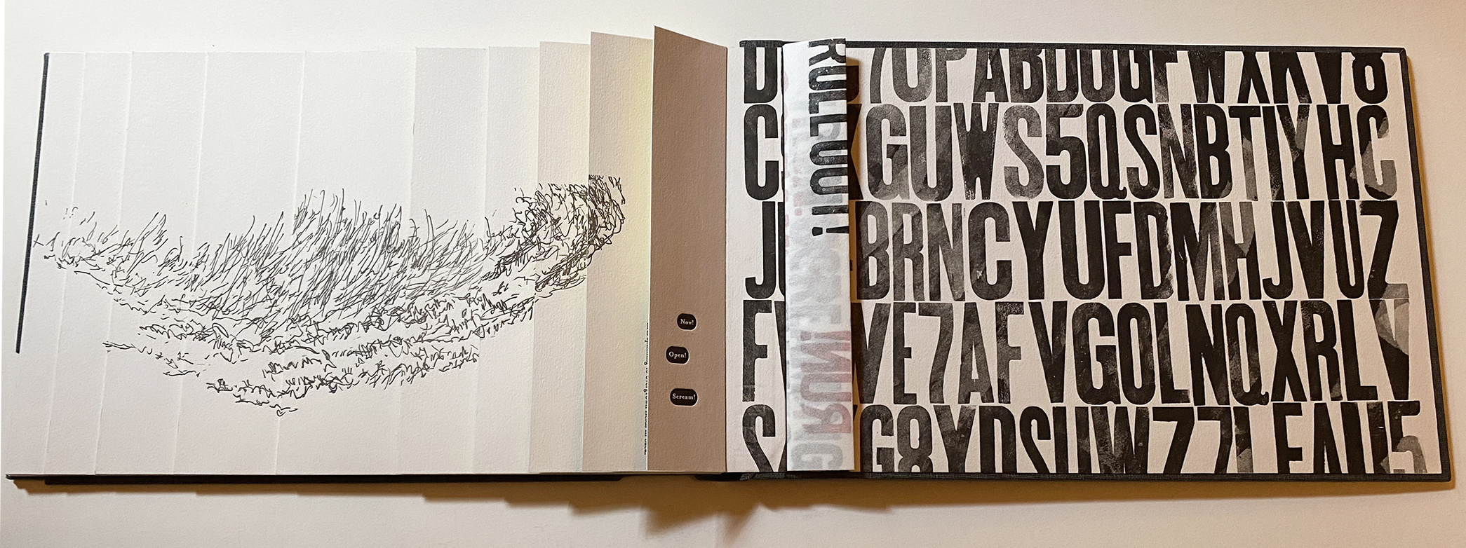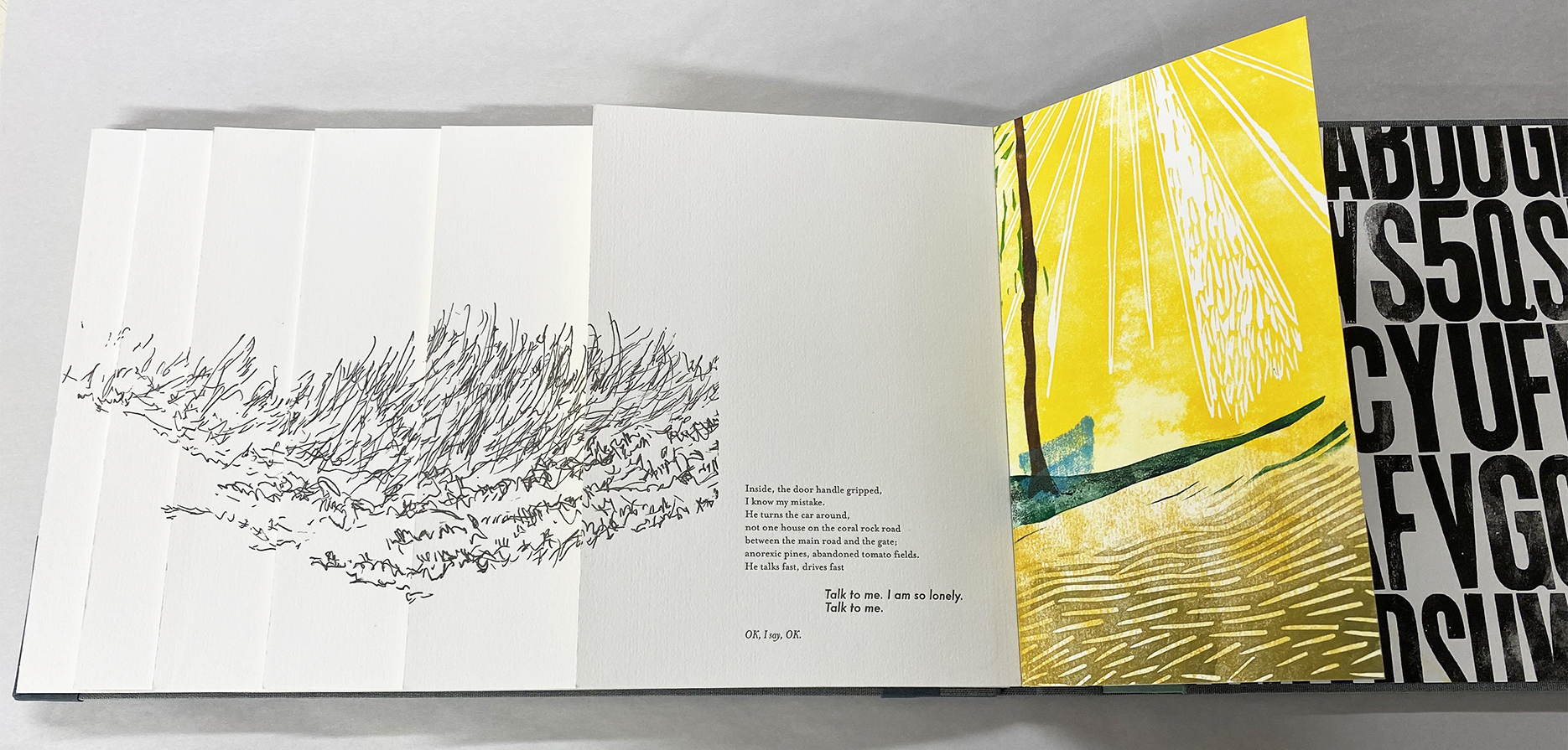 I Know How To Be Helpful, a letterpress printed, limited edition by Z’roah Press, is a collision of 3 different visual elements: pen and ink drawing, linocut and the mass of woodtype. Metaphorically and structurally it presents the loss of innocence of a young girl. The idyllic landscape disappears, and the gritty black and white drawing composes itself as the pages turn. The action of the book mirrors the tension of the protagonist, and we hold our breath to find out if she escapes. The book is bound in a drum leaf structure, with pages that get gradually shorter. The body of the reader must adjust, as the path of the protagonist changes direction and picks up speed. The poem, by the same name, is by Lisa Wujnovich.