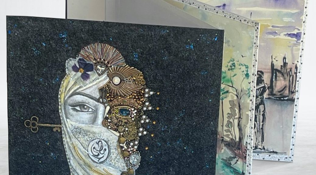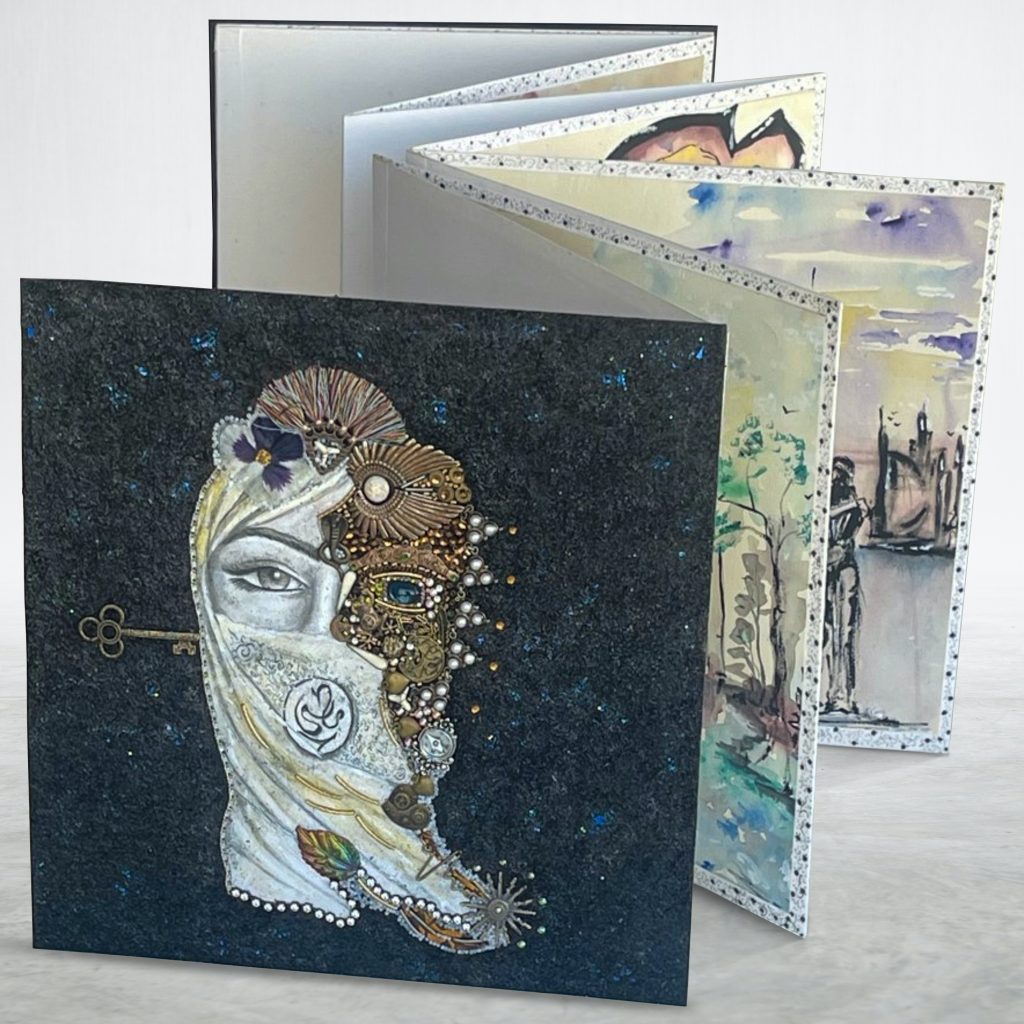 With this book art, we tell the story of one Arab woman born during a time of war and religious division, who ultimately learns to break through the societal rules handed down to her. She learns her own strength and is ultimately able to recognize that the “Others” she has been warned about are in reality not so very different. Her inter-religious marriage leads to societal rejection which is only overcome by moving away from her homeland.