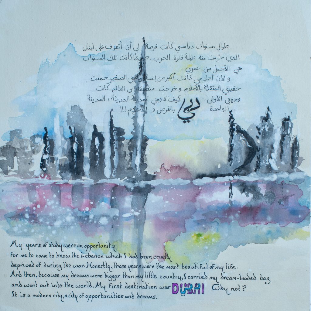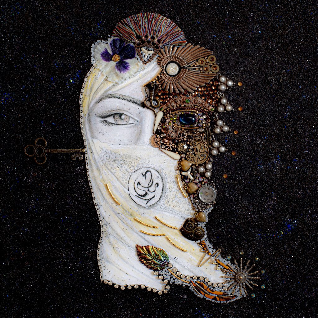 The cover art shows our woman, multi-layered and symbolically pieced together by different media (acrylic, metal mosaic, glass) reflecting the perspectives that have left their mark on her and made a unique, individualistic self. Having already broken with many traditional rules such as the division between religions, she stands ready to tell her story; her image speaks for itself and allows the viewer to enter into the bilingual illustrated narrative (Arabic/English) and explore the inner-workings and meaning of the objects, events and beliefs of which she is made.