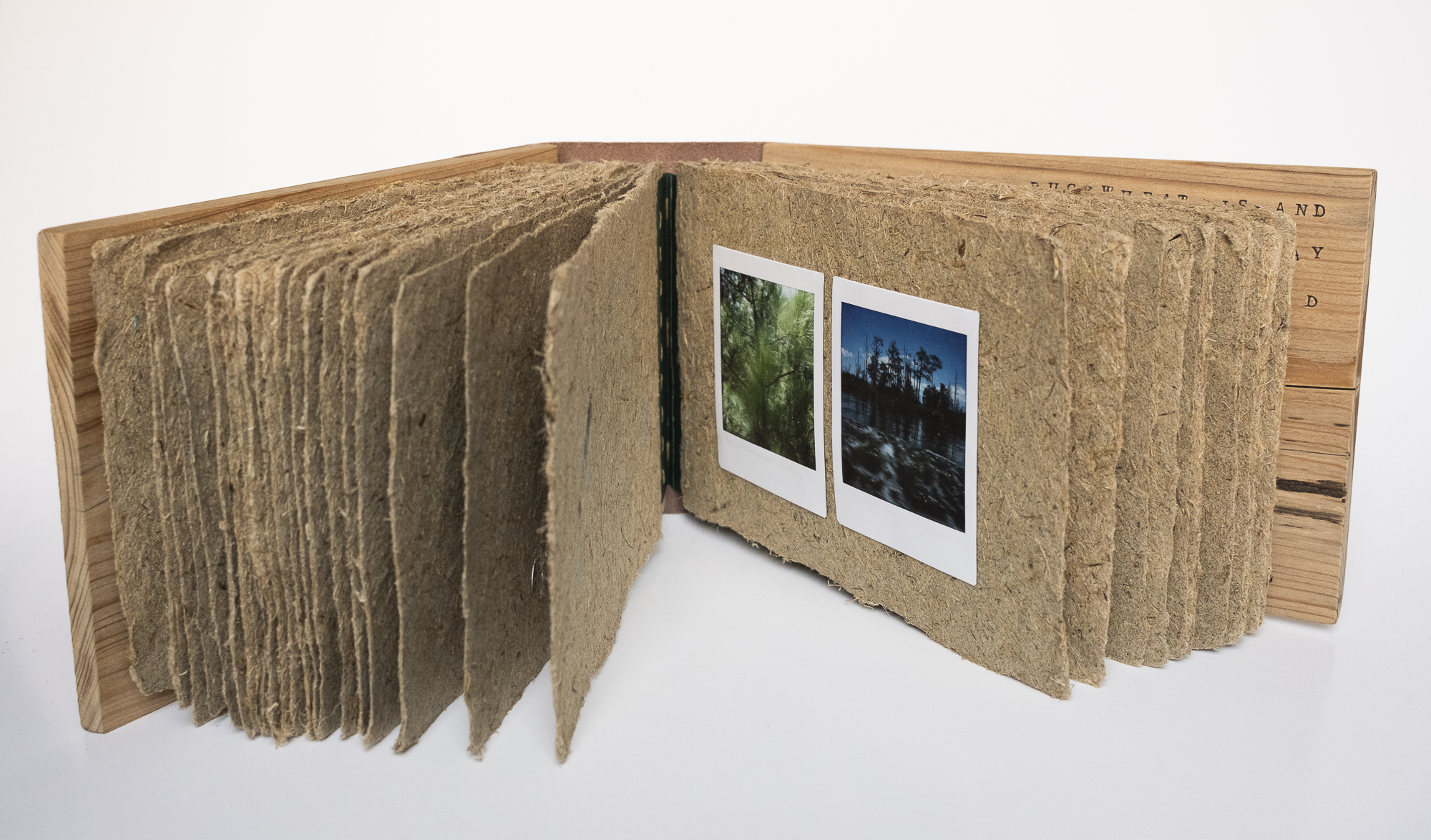 Unique artist’s book: wooden covers, leather spine with linen thread, handmade phragmites paper with nature embeds, instant film photographs, miniature notebook