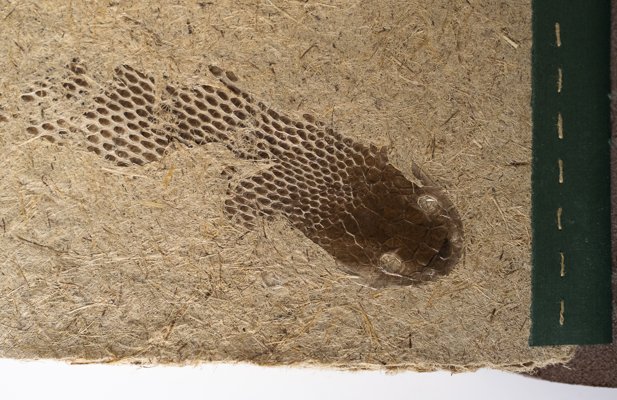 The Island showcases instant film photographs that capture a portrait of the private hunting island, eerie and beautiful, with hints of its human caretakers. Its cypress wood covers were once part of the cabin. Each page is unique in texture, color, and shape thanks to the handmade paper that uses only phragmites — the invasive reed species taking over Maryland’s wetlands. Nature findings, like snake skin sheds, bayberry leaves, and mushrooms, are embedded in the pages and joined by less natural findings like toilet paper from the outhouse and paint chips peeled from the cabin. Flipping through its pages brings forward the smell of the brackish marsh with hints of Old Bay seasoning.