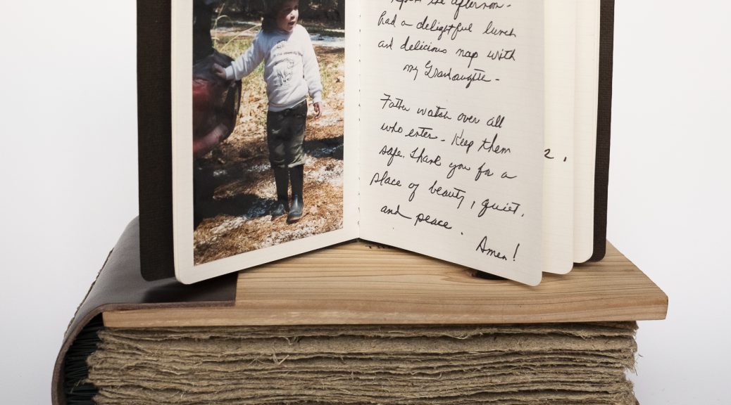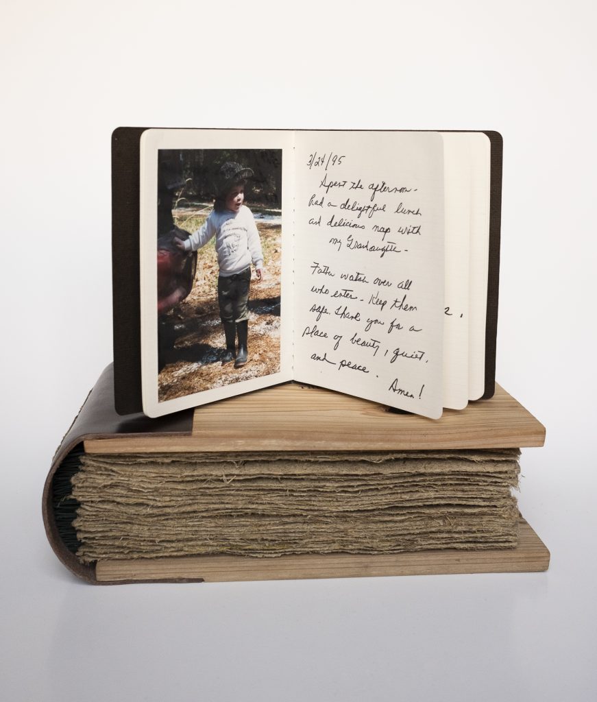 A miniature, hand-sewn composition notebook, much like the one that lives at the island for its visitors to write in, waits for the viewer in the back pocket. It shares the artist’s personal connection to the place through family photos and journal entries spanning 1993 to 2023, from ages 3 months to 30 years.