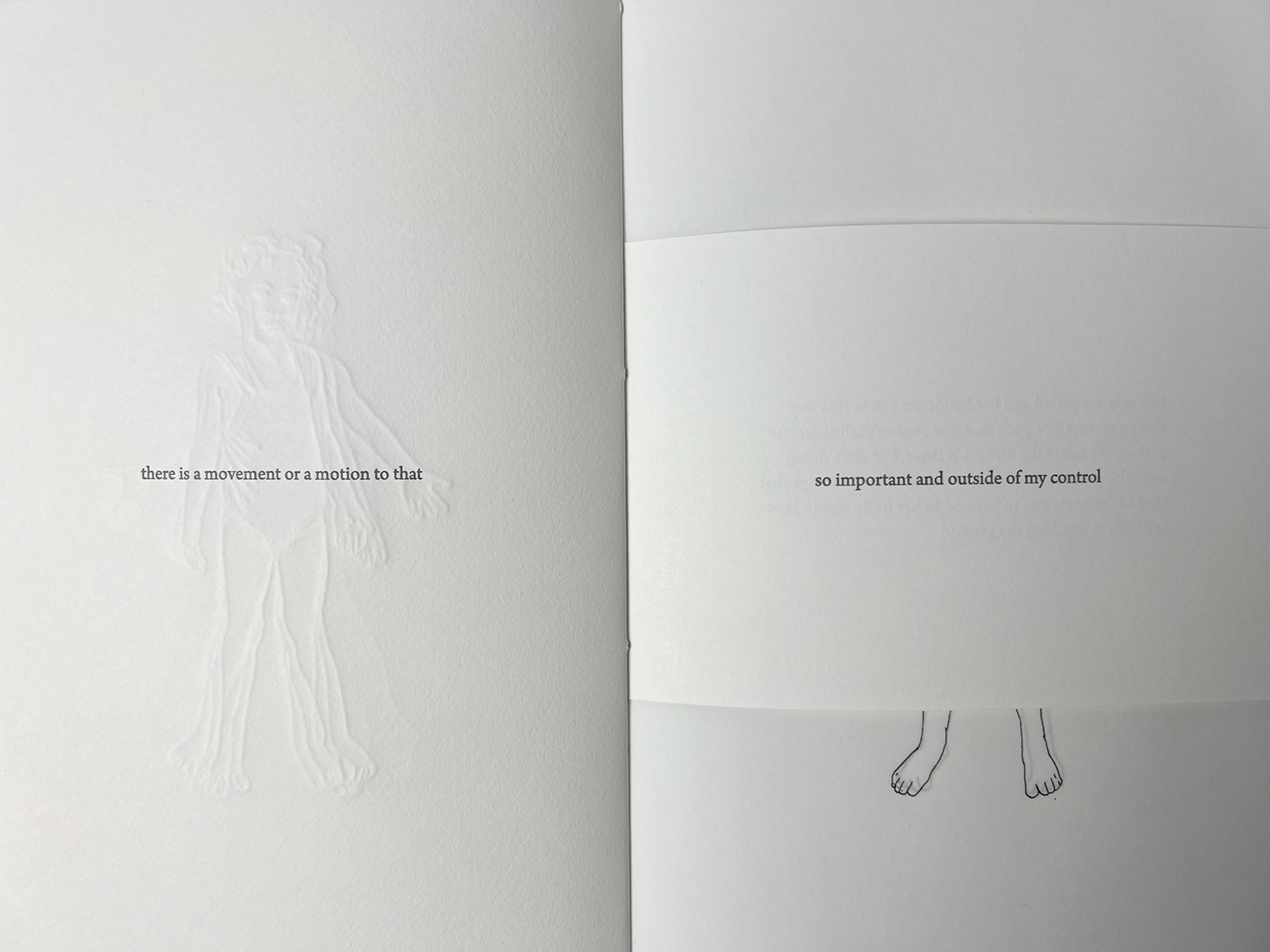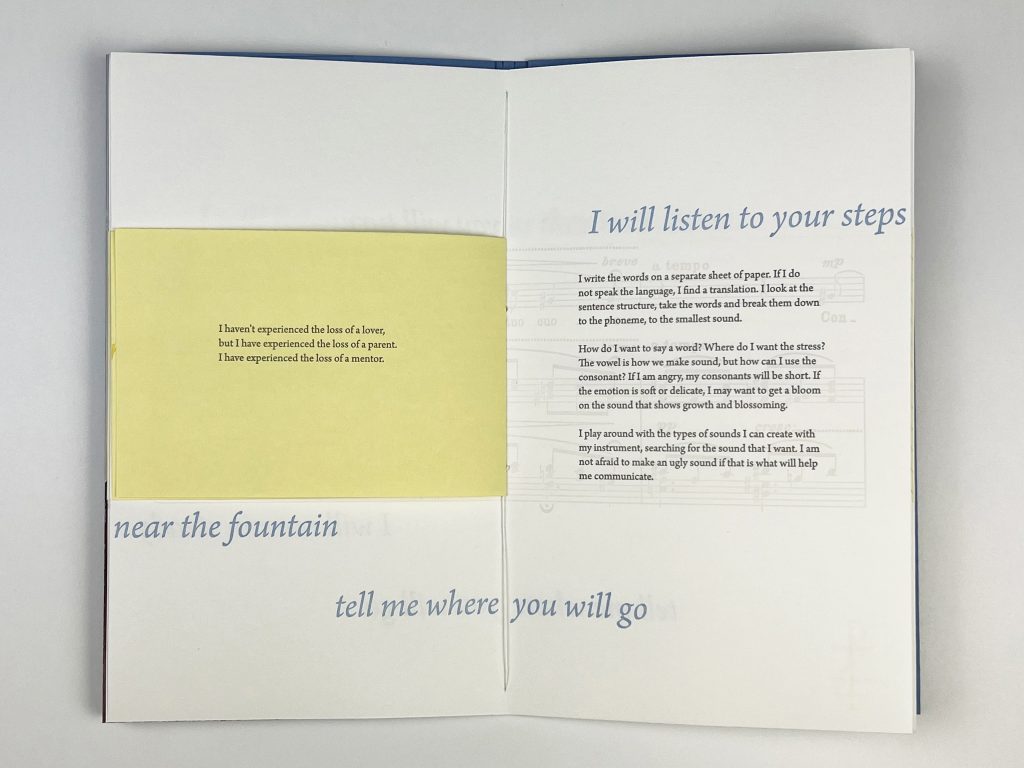 These voices and experiences, housed together, offer unexpected points of connection across disciplines. This project seeks to highlight our shared experience, even when what we have in common is the difficulty inherent in communicating across divides. Each of the components in this book effectively captures two acts of translation: first, the particular act of conversion and communication performed by individuals at the heart of the book; second, my work as an artist to represent their act through the combination of text, image, material, and structure. Acts of Translation can be expanded to reveal all five acts at once, or collapsed so that the texts from any two can be examined side by side. The book can therefore be read across the collaborations, revealing language that links our experience and highlights overlapping themes.