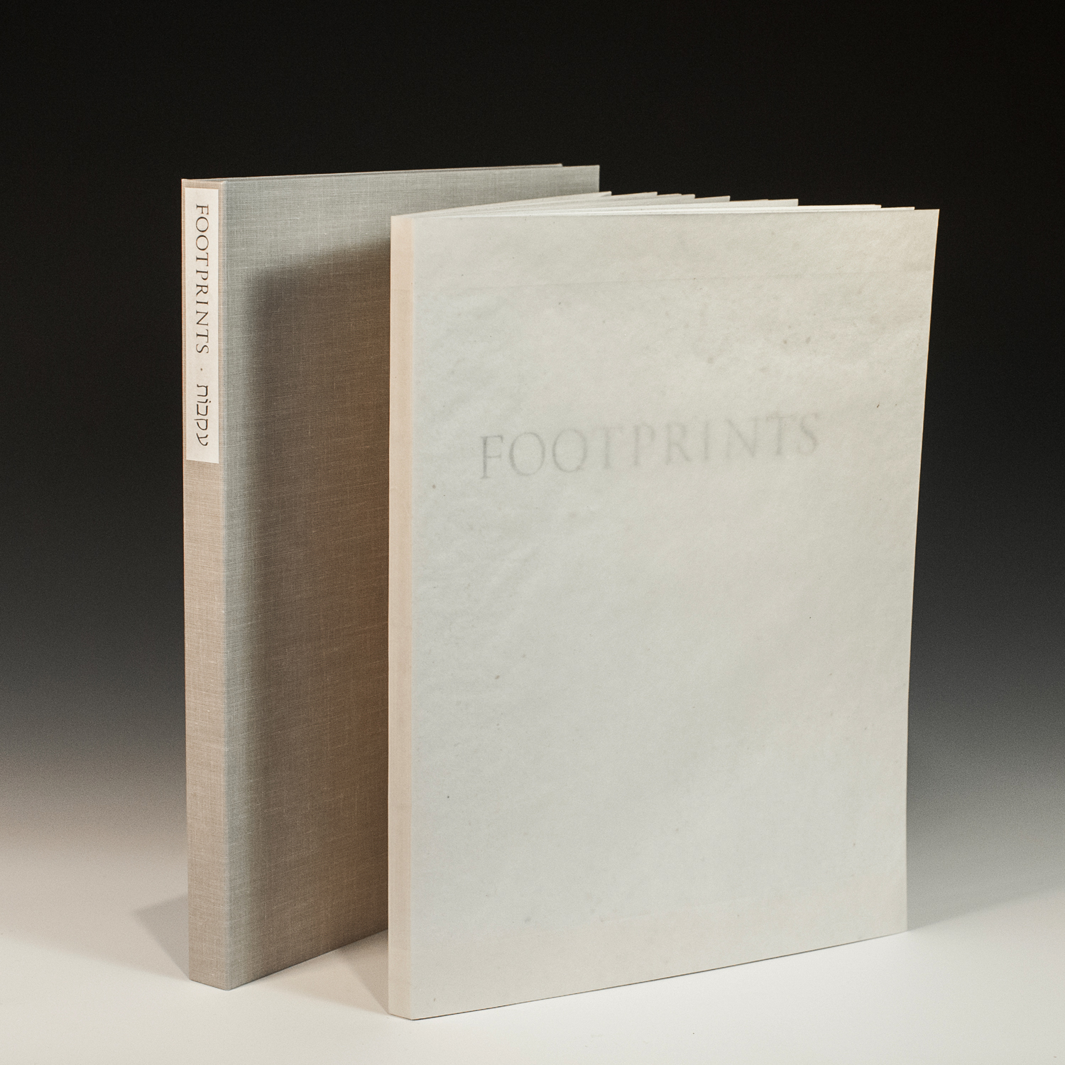 Cover from right ‘Footprints’ and left ‘Akevot’ (in Hebrew), representing the original poem and its translation that are the foundation of the book. The titles are intentionally partially obscured by the translucent abaca wrapper, but readable when held in one’s hand.