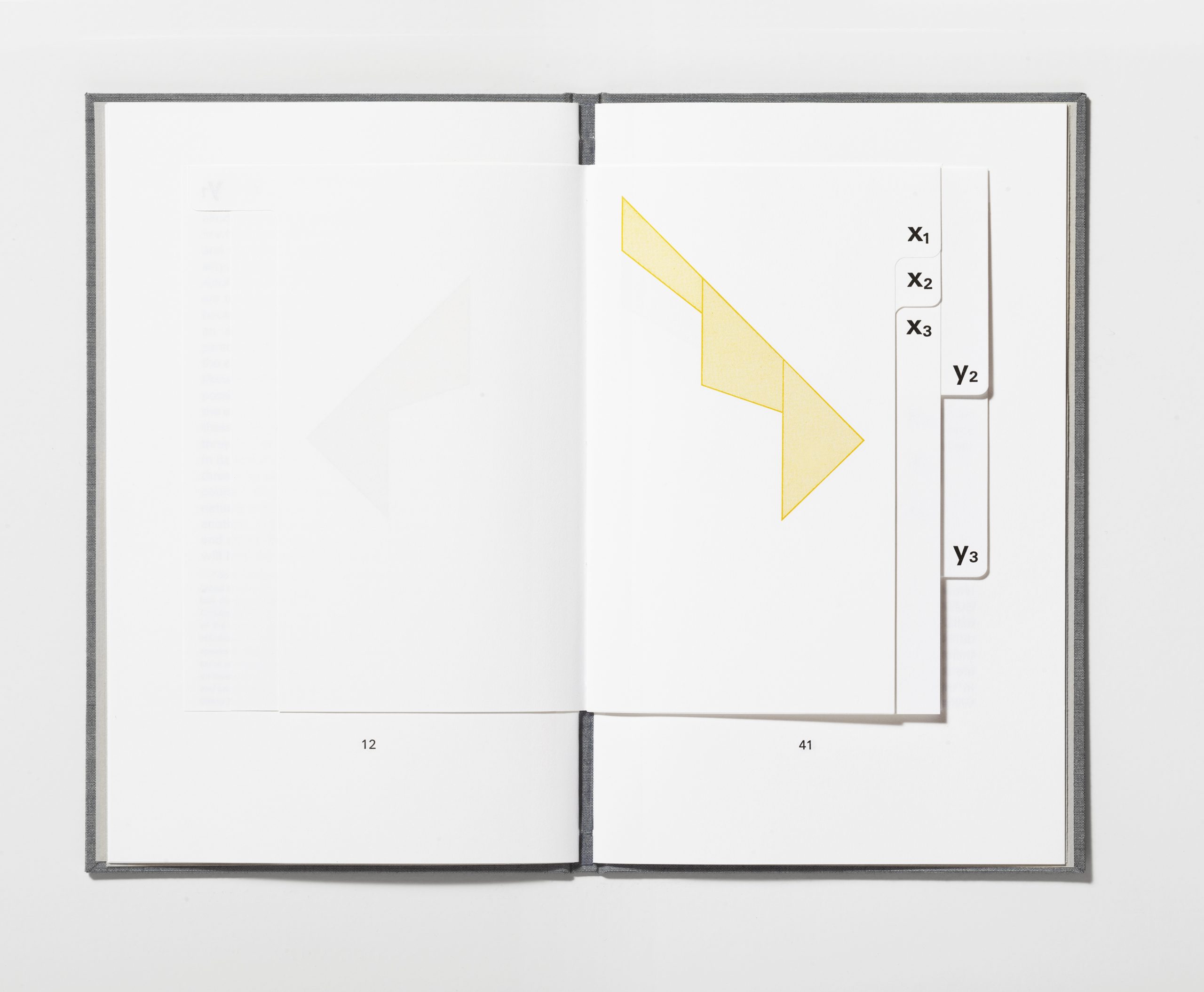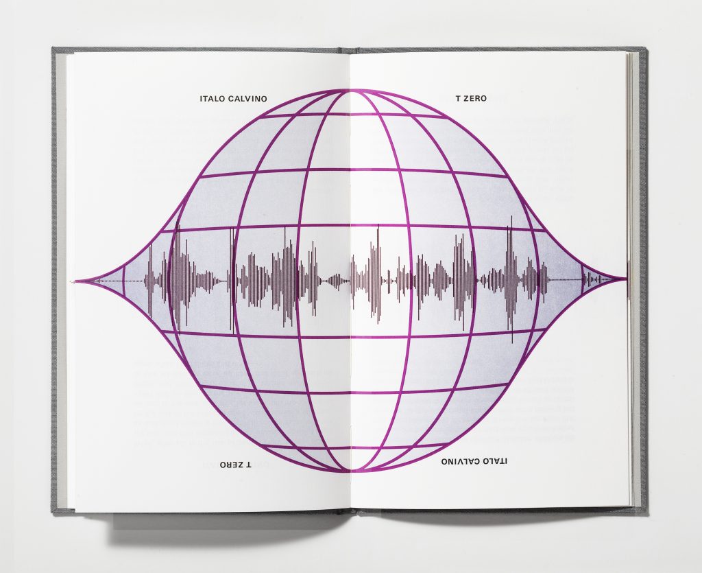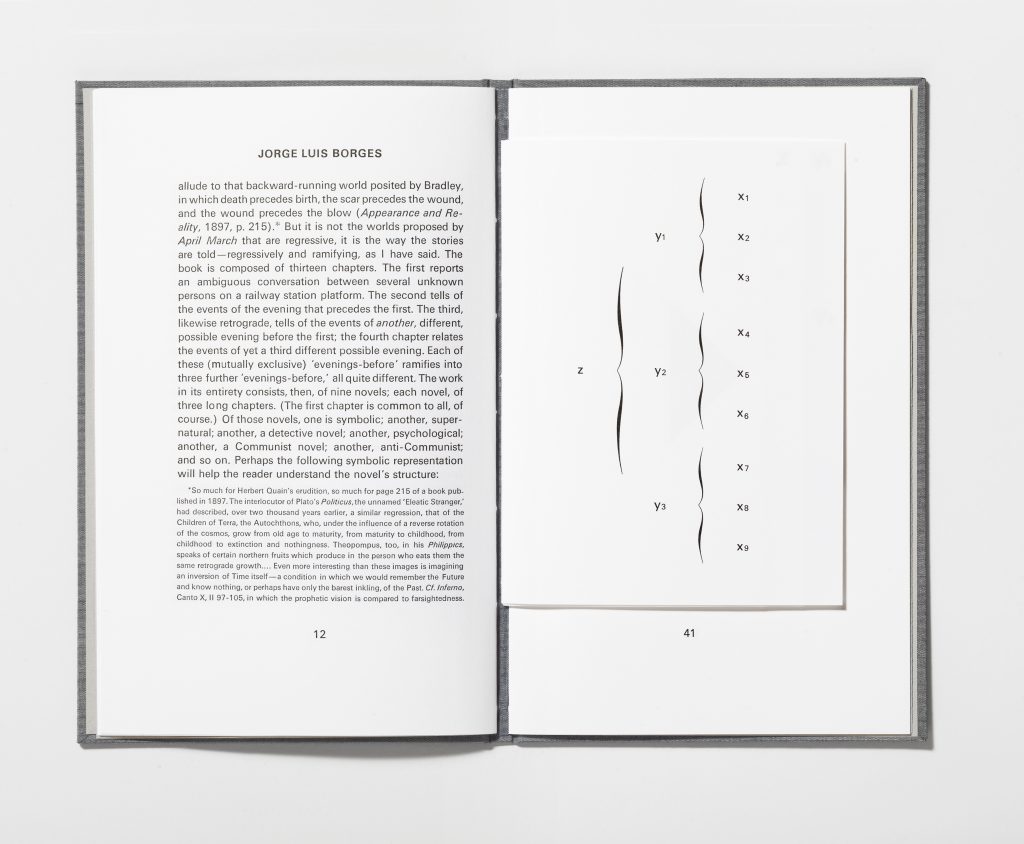 Each volume of Allochronologies takes one kind of chronology and, using excerpts of fiction by some of the great 20th century writers, creates a book that physically embodies that conception of time. The theory of multiple universes is explored through a story-within-a-story by Jorge Luis Borges; an imagined novel is described in which nine different outcomes are possible depending on the path one chooses through a physical, thumb-index diagram of the plot. Or we may find that at the end of time, the cosmos collapses into a Big Crunch, before undergoing another Big Bang and “swinging back on itself,” as the central character in a story by Italo Calvino imagines; here that possibility is embodied in a volume that can be read cyclically within each opening, as well as identically from the beginning or end of the book. Lastly, a story by Alan Lightman in which time’s arrow runs in reverse—rotten fruit becomes ripe again, one can remember the past, people age in reverse—is explored in multiple backward-running versions: with the sentences reversed, the words reversed, and, mostly oddly, the sounds reversed, thereby enacting a reversal of entropy itself.
