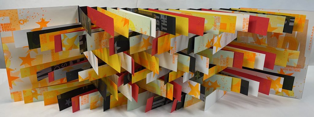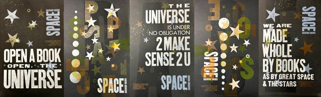 Emeritz & Matthews (E&M) use the form and function of letterpress printing and book arts as a vehicle to express their creativity. They tapped into their existing bookbinding knowledge and explored other unknown book structures. E&M researched Galileo Galilei’s book called “Sidereus Nuncius.” Galileo’s charting and illustrating of the constellations inspired them. You can find the illustrations embedded within the letterpress prints that E&M designed and printed.