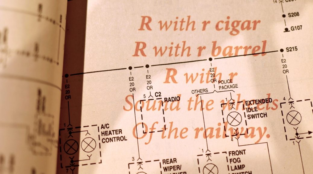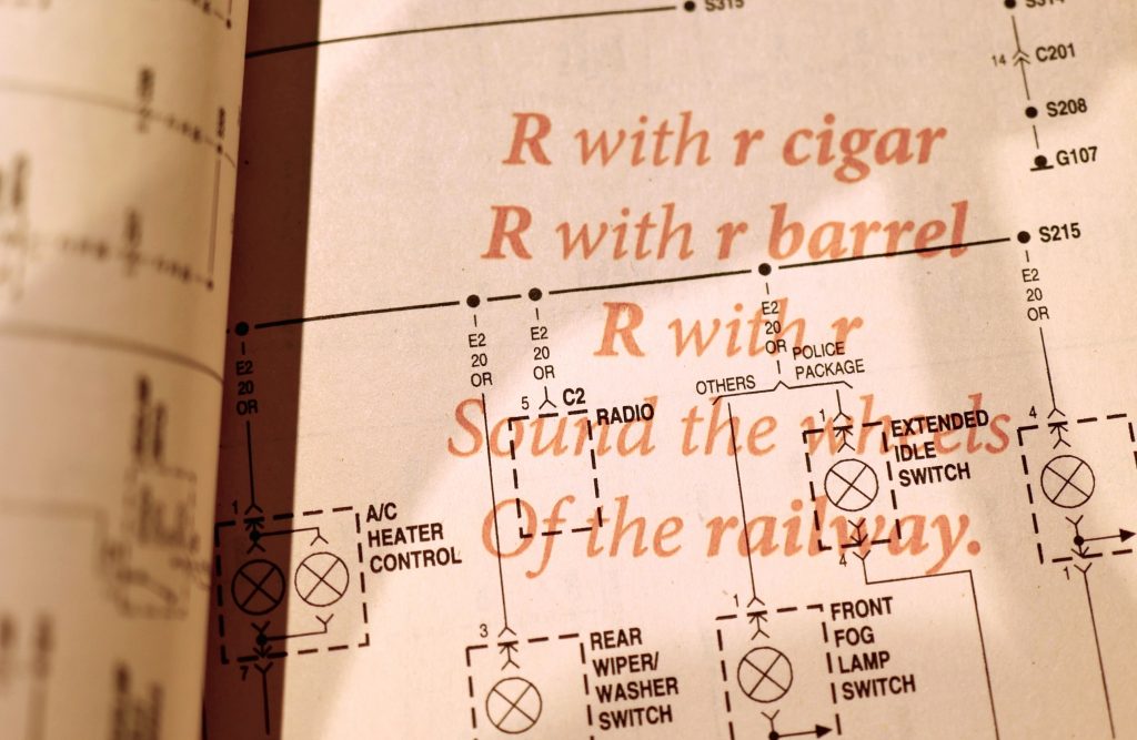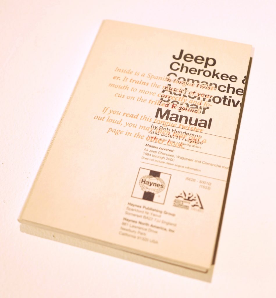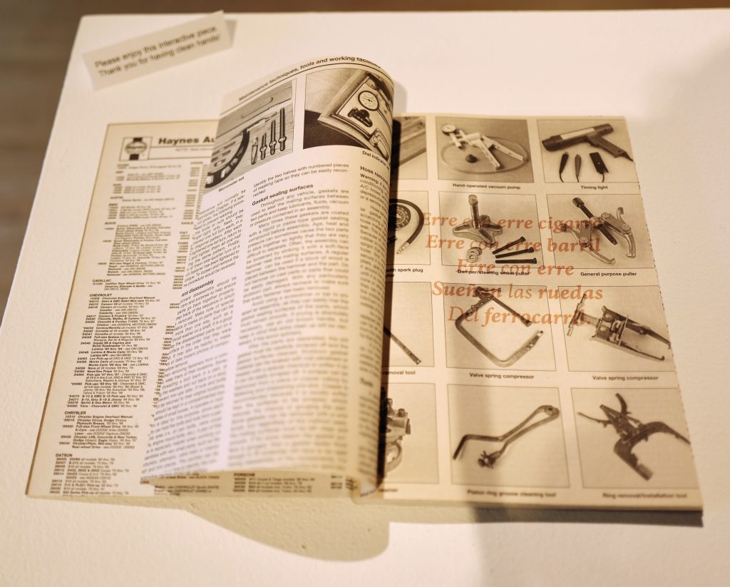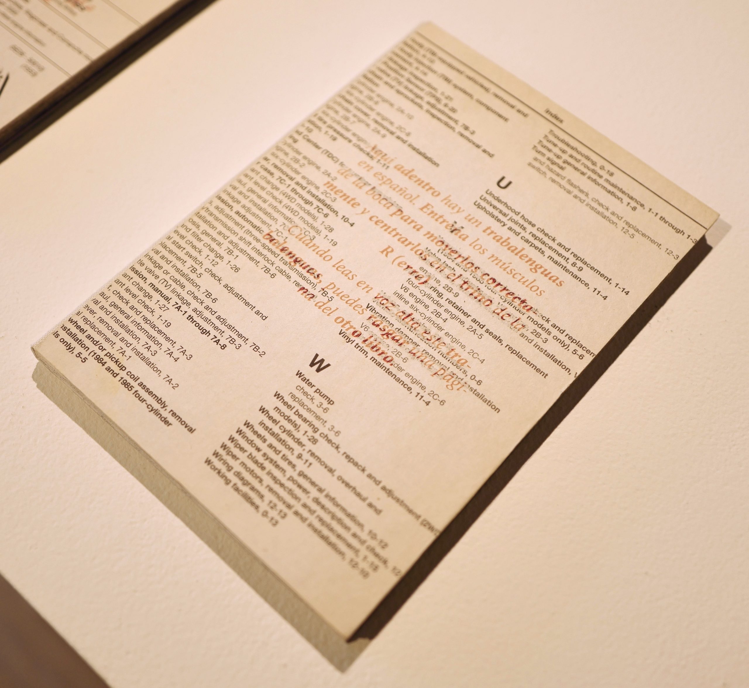 Yet, guests of course have a choice. If they choose to engage with the piece, their knowledge and comfortability with either English or Spanish will allow them to understand one of the two covers with instructions. When they then open that book, they will find the text block in the other language. The English covered book has the text block in Spanish and the Spanish covered book in English. Guests then will be confronted with the choice to try reading in the language in which they perhaps have less experience, trying to pronounce this trabalenguas, and then getting to remove a page from the other book. Over time, the choices audiences make will be displayed in what pages remain of the two books, themselves sisters. Both are created from a single recycled car repair manual, the English covered Spanish text block book comprised of the first half of the manual, and the Spanish covered English text block book comprised of the second half. Not only is this installation an experiment, but a reminder, via car manual, that the history of language cannot be divorced from the physical material of the world, nor the mechanical ways we try to train our mouths to accommodate different linguistic paradigms.