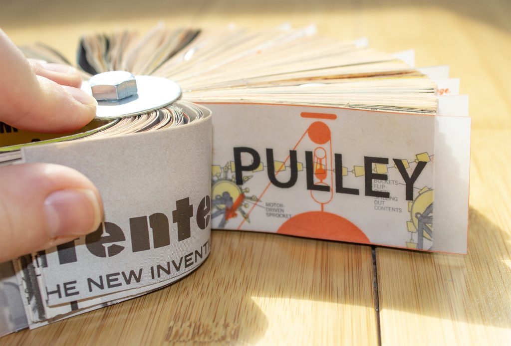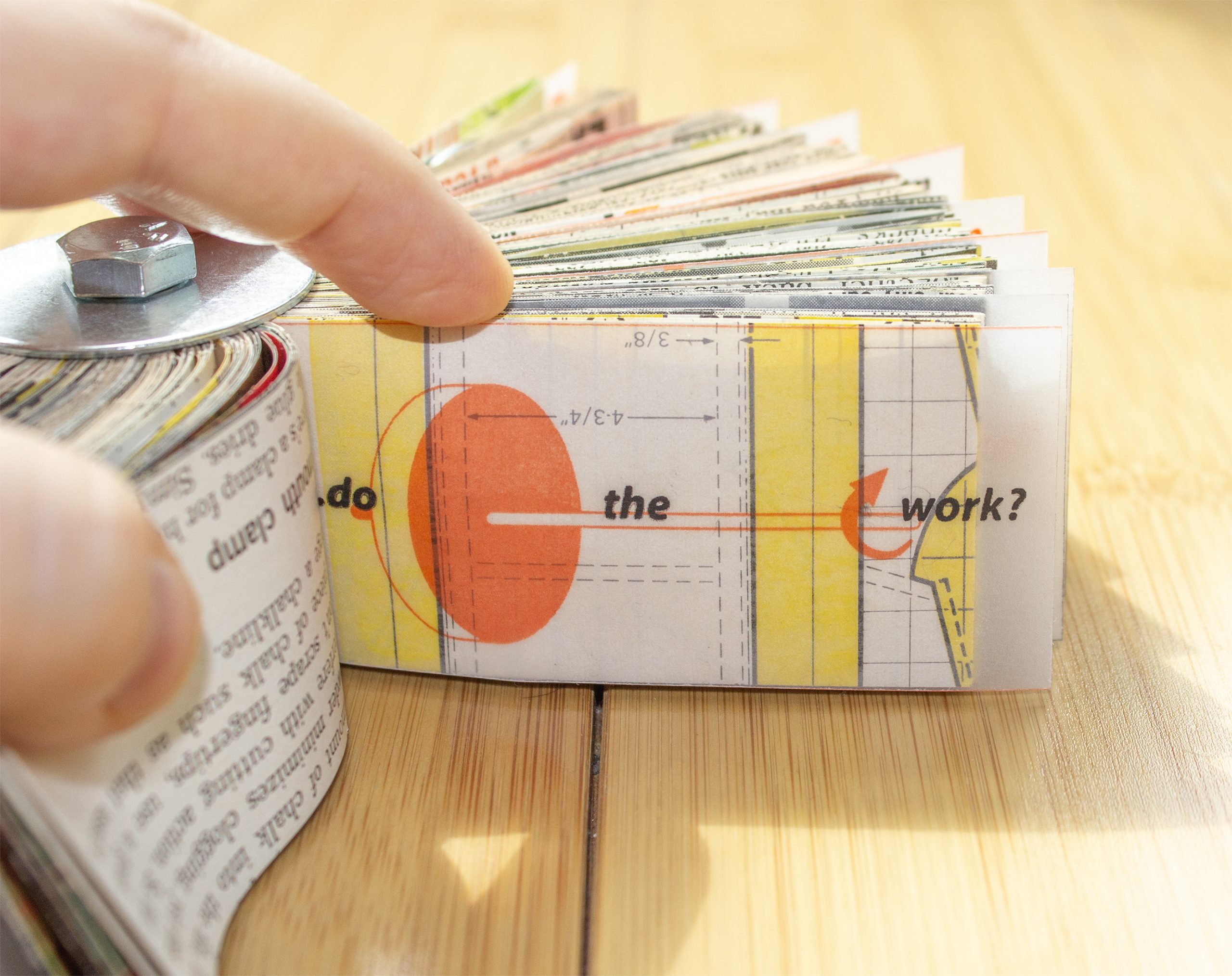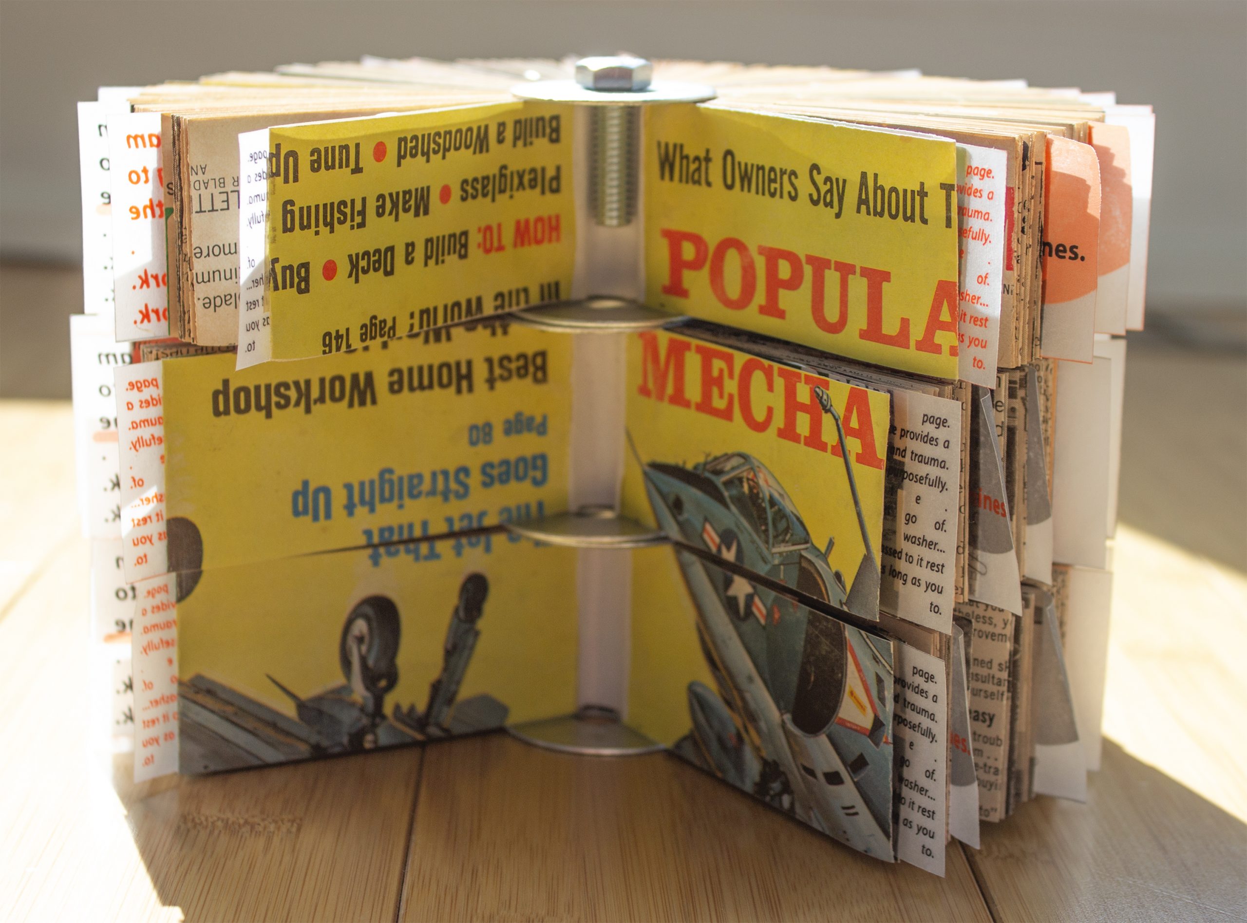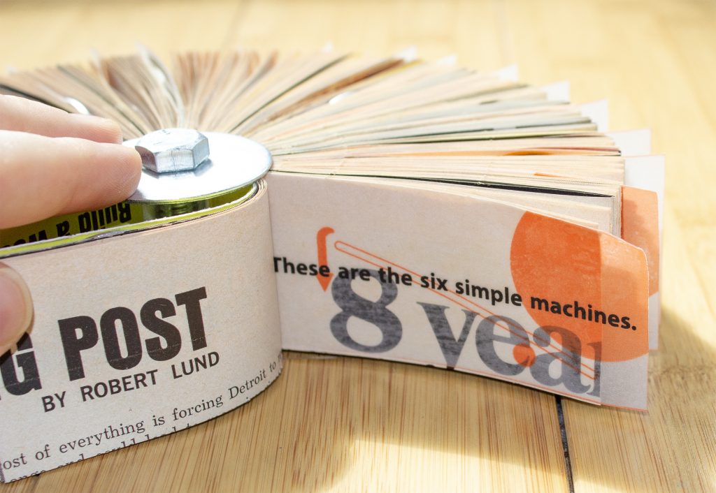 It is formed from the combination of simple machines contained in its pages, screen printed in layers of red and black ink on vellum, overlapping images of the simple machines with the words that tell their story. These vellum inserts fan out throughout the pages of the book like notches in a gear, turning their way slowly and methodically around the central axis of the book for viewers to read. The main body is constructed from a slice of a recycled American popular science and technology magazine called Popular Mechanics. Founded at the turn of the 20th century, this magazine was meant to engage the typical American man in diy repairs, hacks, and gadgetry to properly maintain his home, car, and property while selling and showcasing tools and parts.