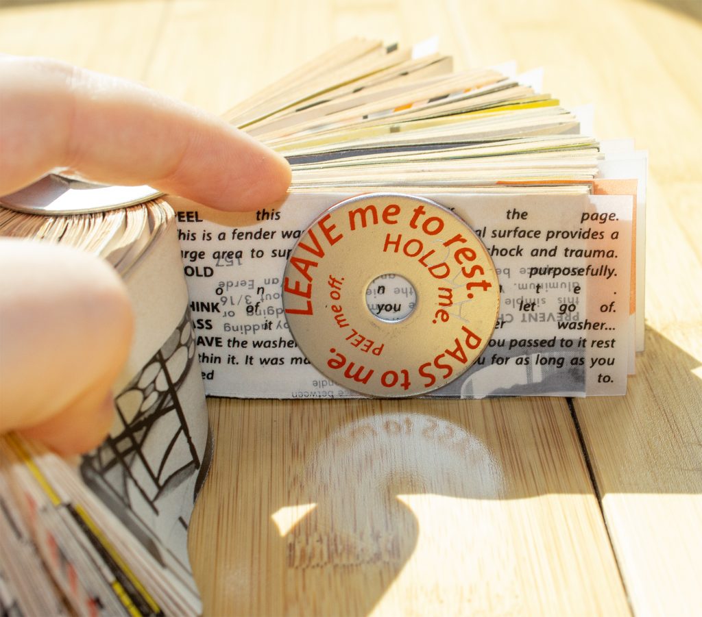 To aid this unacknowledged work and combat disproportionate strain, this book contains some hidden parts. There are four galvanized steel fender washers lightly taped onto pieces of the printed vellum inserts with instructions. Fender washers are designed to be load-bearing: to absorb shock and trauma from their environments. They are humble parts. Unassuming. Hidden under larger nuts and bolts. Viewers are given the following instructions: Peel off the washers. Hold them purposefully. Concentrate. Pass something you want to let go of to the washer, which can be left in a secret place. It will hold what you ask it to hold, as long as you need it.