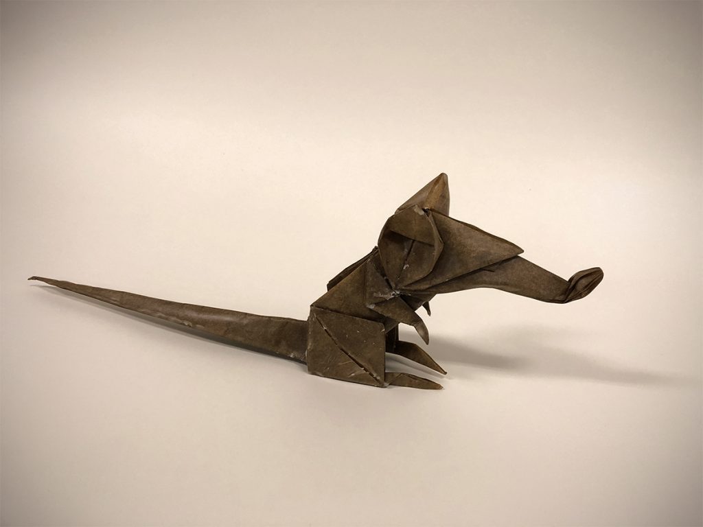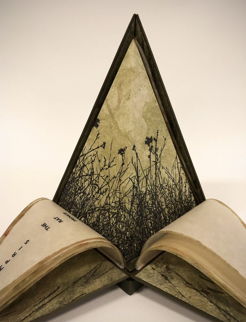 The story started with Samuel, my son, the poet and folder. Inspiring and guiding Samuel was Eric Joisel, master folder and inventor of the rat figure, an artist of wild imagination and talent. I stepped in, drawn into the world of Lempris, central character of the poem, a very Nietzschean rat, to transform the lines of poetry into a pyramidal artists’ book. In the beginning the pyramid had three walls.They were paper, then leather walls etched with shrubs and branches, telling the rat’s painful attempts to escape his torments. Samuel suggested adding a fourth (non imaginary!) wall so we could incorporate the rat’s folding pattern.These powerful lines became a new focus of the book and I decided to bring them to light!