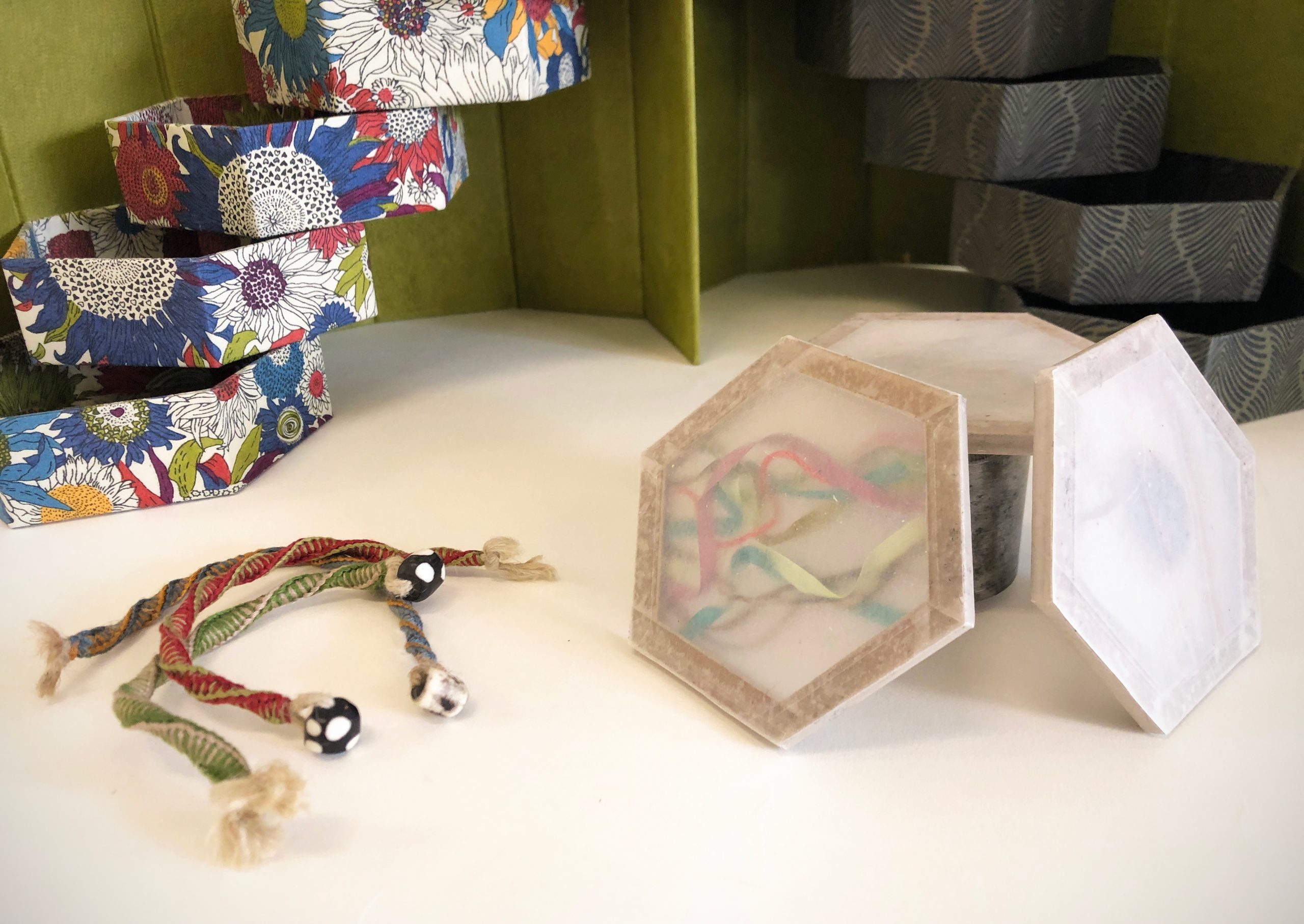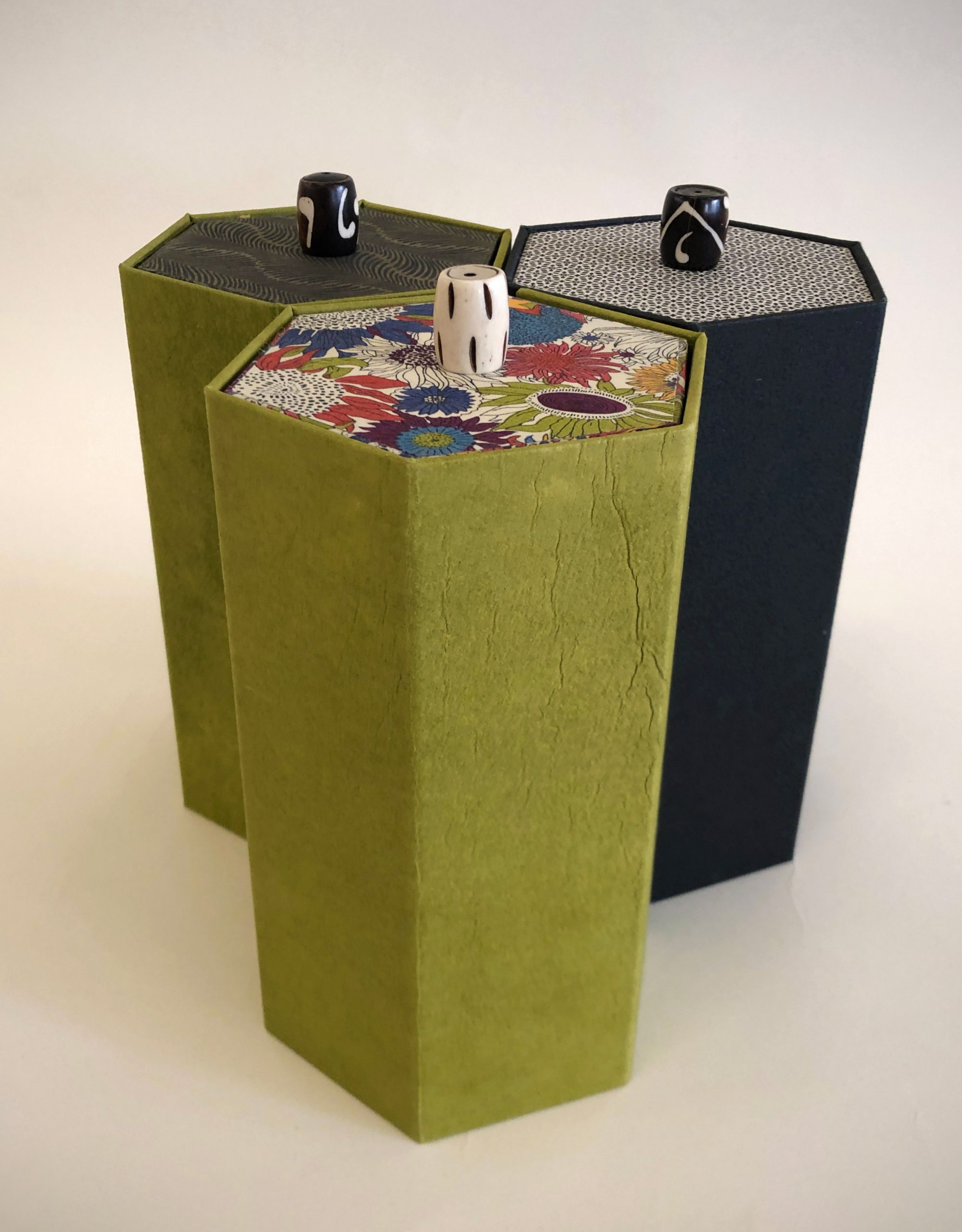 Text and textile share the same etymological root. A key process in the cell cycle, mitosis, derives its name from the Greek word mitos, thread. The book plays with the origin of words and how they echo each other when used in science or in the arts to convey various ways of analyzing the world. This is reinforced by the multiple ways one can enter the book and its different narratives: Vertical Drawers from bottom to top: – threads of DNA [double spiral and square knots with DMC embroidery cotton on linen bookbinding cord] – one single cell [silk ribbons, threads and hair, encased in hexagonal structure made of book boards and abaca paper handmade by the artist and covered with beeswax] – one more complex combination of cells [tessellation of handmade abaca paper] – evolution of threads to textile to text [woven hexagonal structures made of walnut dyed paper thread/ Japanese moro-jifu] – sketch book that contains hand written text and drawings narrating some of the research that went into creating the three main stories – story [each book in the upper drawer is a 23 panels hexagonal boustrophedon accordion structure; original drawings and digital printing on Hahnemühle Ingres, finished with beeswax; small magnets hidden in each book’s cover to easily retrieve the books from drawer] Three stories, one in each top drawer: First Box – Clotho, the one who spins the thread of life from the distaff to the spindle.