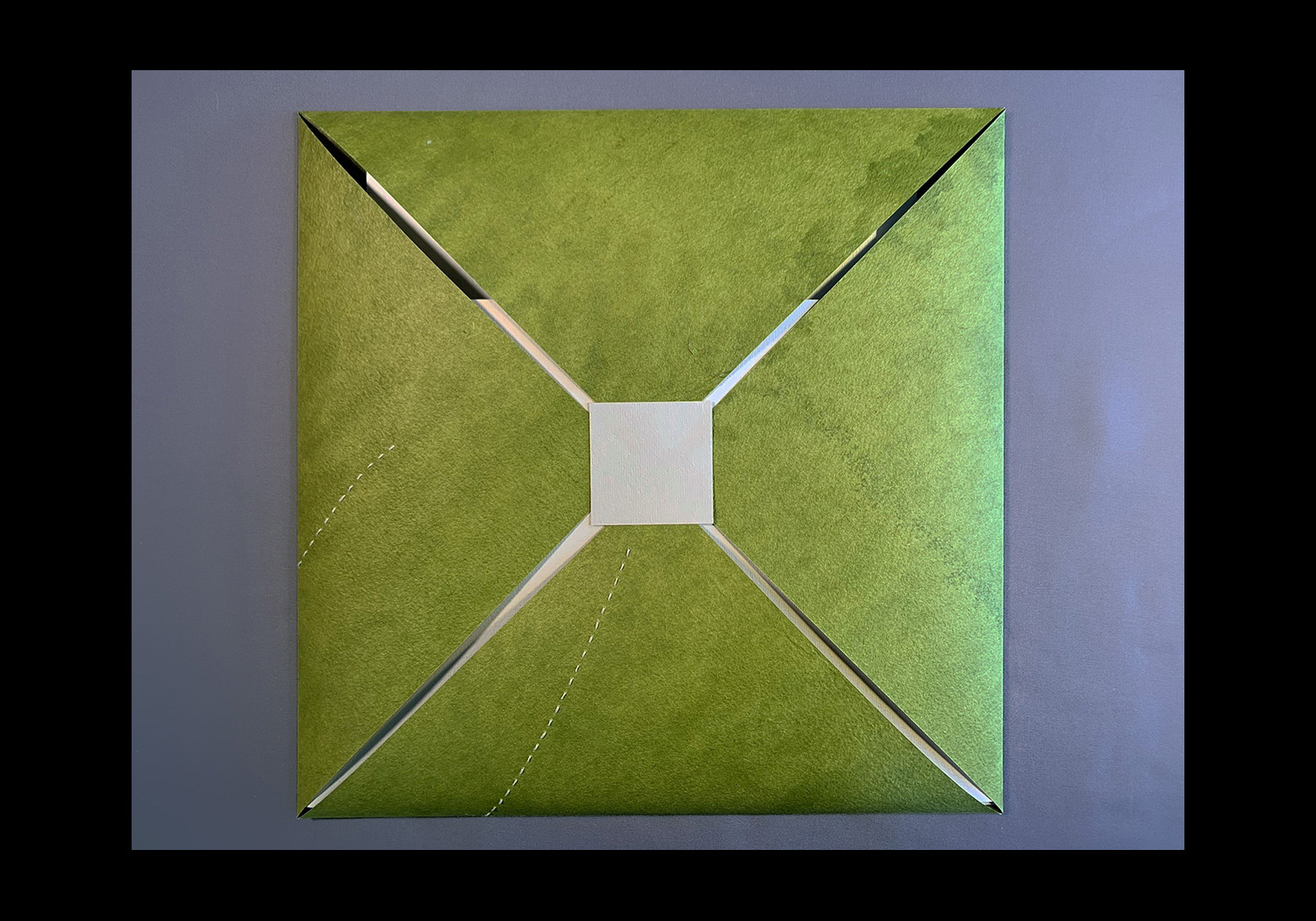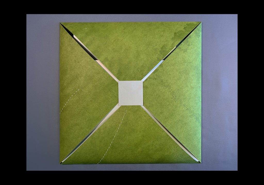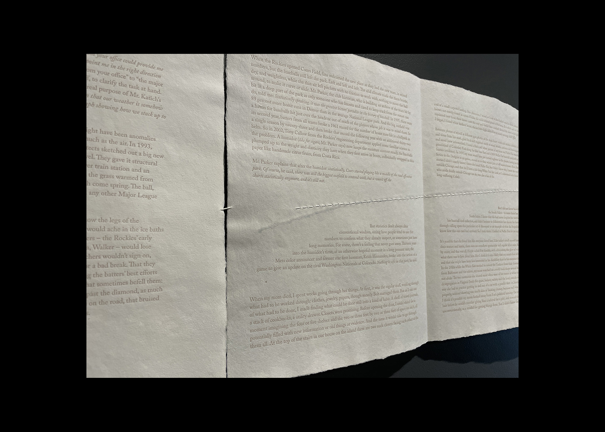 Ground Rules is letterpress printed on a Vandercook Proof Press from polymer plates. The paper is cotton, handmade by the artist with a watermark in each section representing the outfield wall of a baseball park. Additionally, each section is bound with a single sewn line through the center three pages, representing another ballpark, and connecting each page at just the point where it meets the next. The binding is a paper envelope with decorative stitching. When each section is fully opened, the three watermarks and sewn lines representing six of the parks featured in the text are visible.