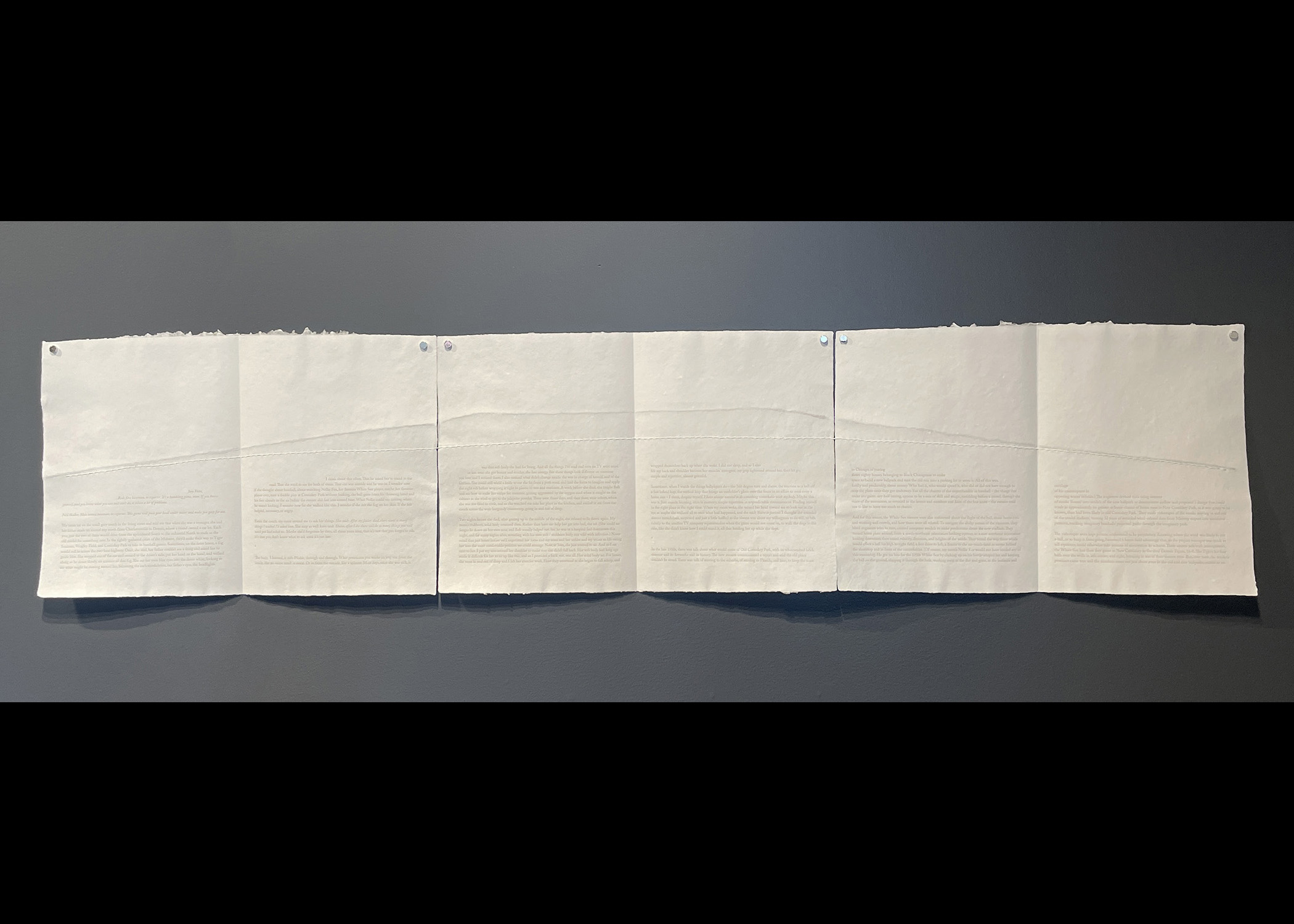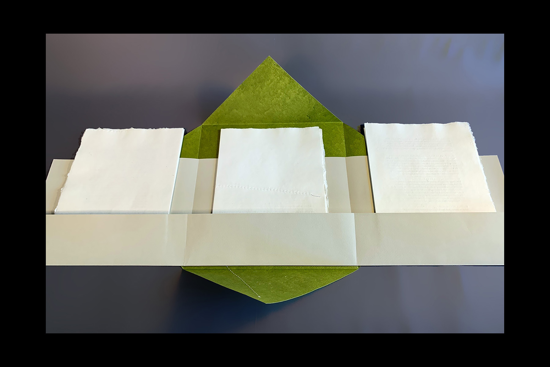 handmade paper with watermark, letterpress printing, handsewn; cover is folded paper with sewn pattern