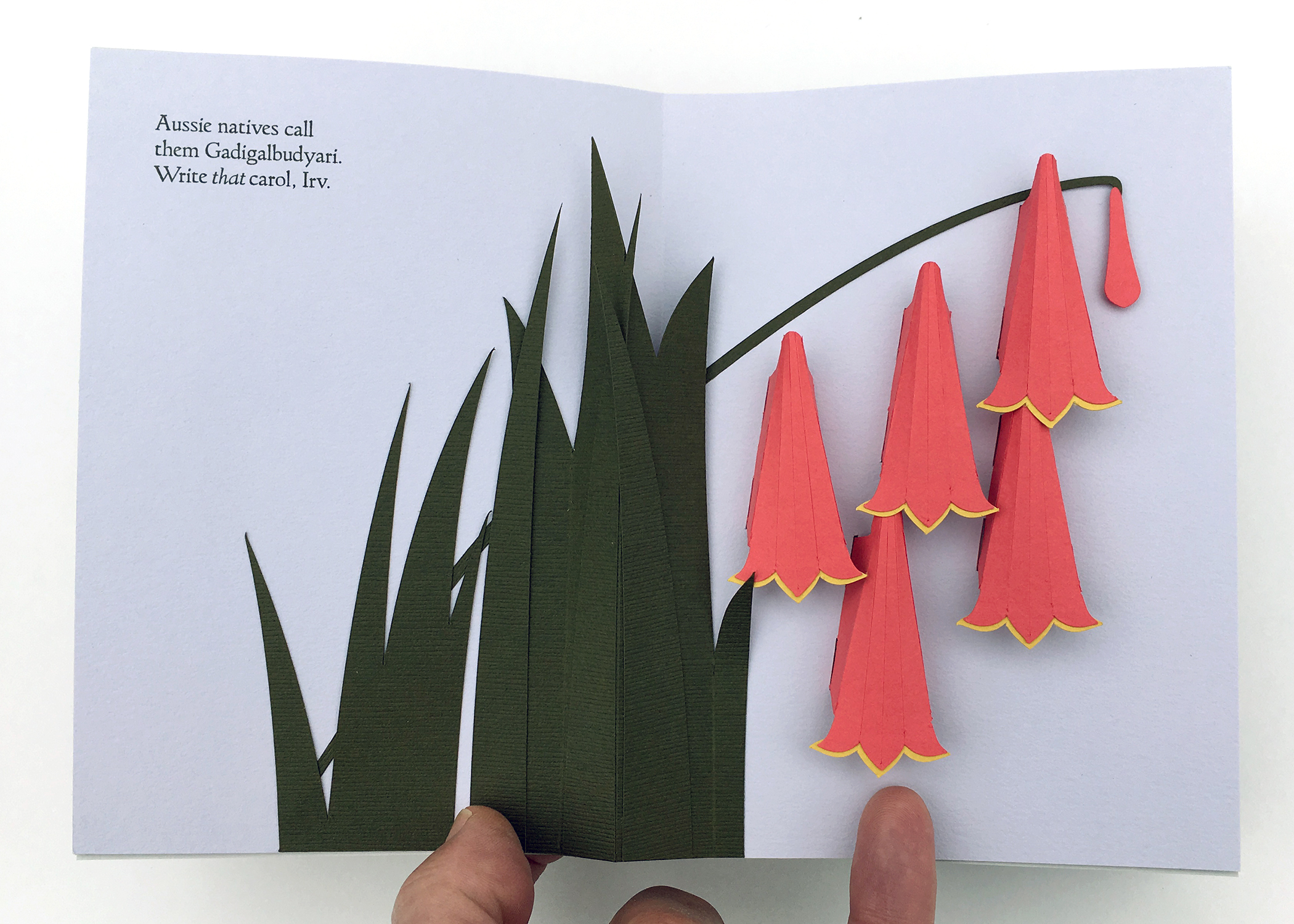 Fresh Cut Xmas: A Well-Trimmed Survey of Holiday Plants celebrates the flora that has played a role in winter holidays for centuries. In contrast with the excess of contemporary seasonal traditions, the style of this pop-up book is distinctly minimal; the palette is spare, the baubles are few, and the text on each page is composed using the haiku’s 17 stark syllables. Here’s a sample from the frankincense spread: