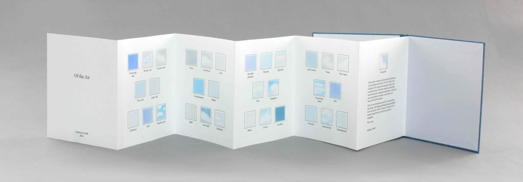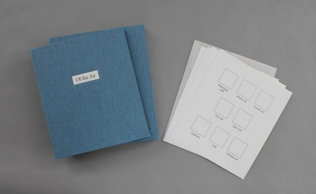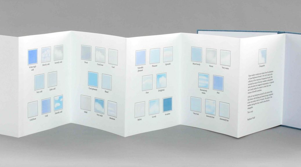 Of the Air contains weather notations drawn from the almanacs of a 19th century N.J. woman, Anna Blackwood Howell, which were kept from the early 1800s until her death in 1855. These descriptions are interpreted through tiny watercolor paintings, imagined skies of the temperature these words are meant to evoke.