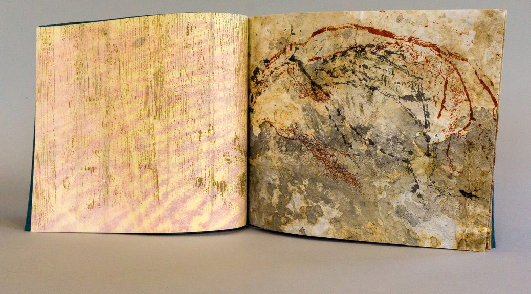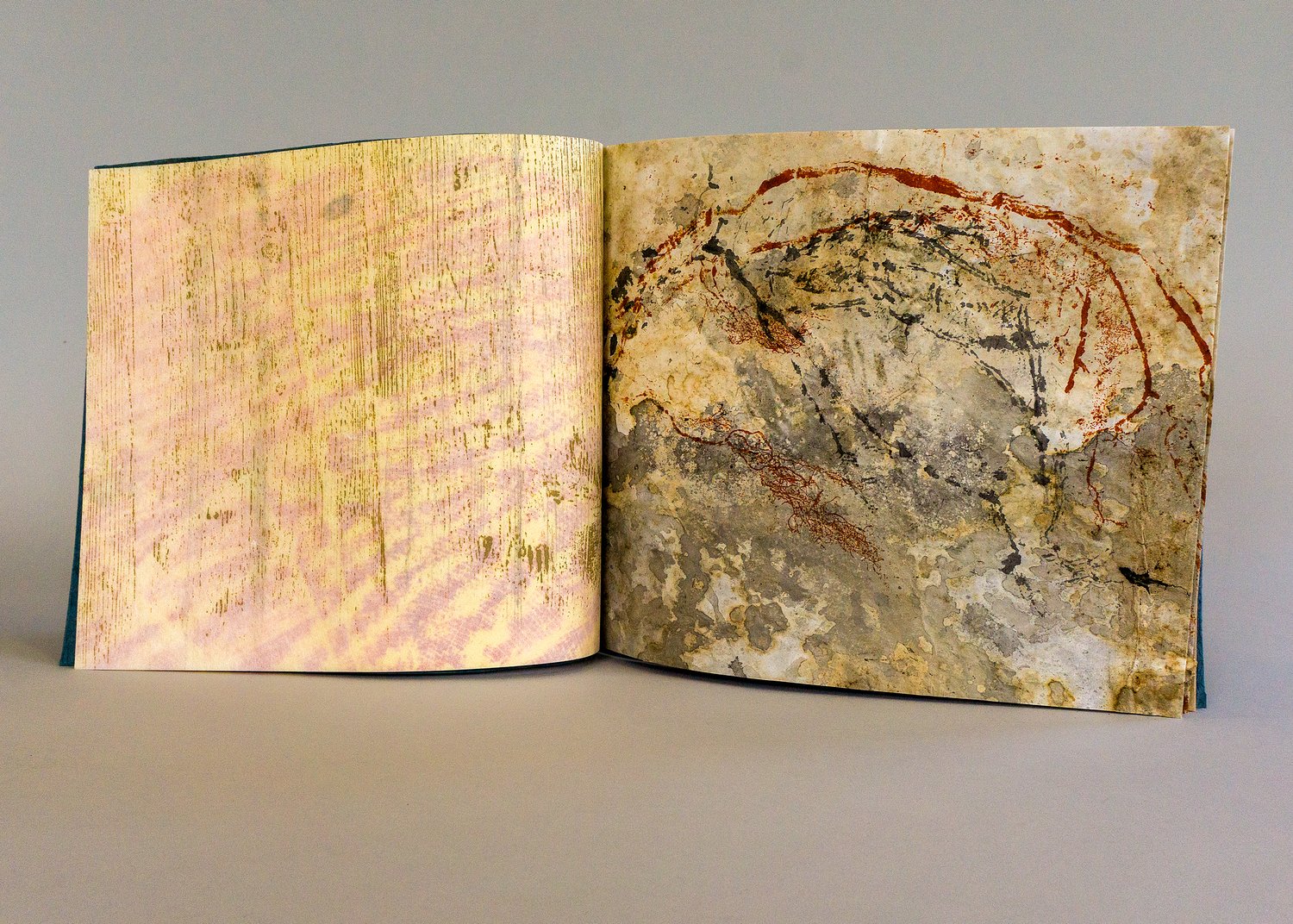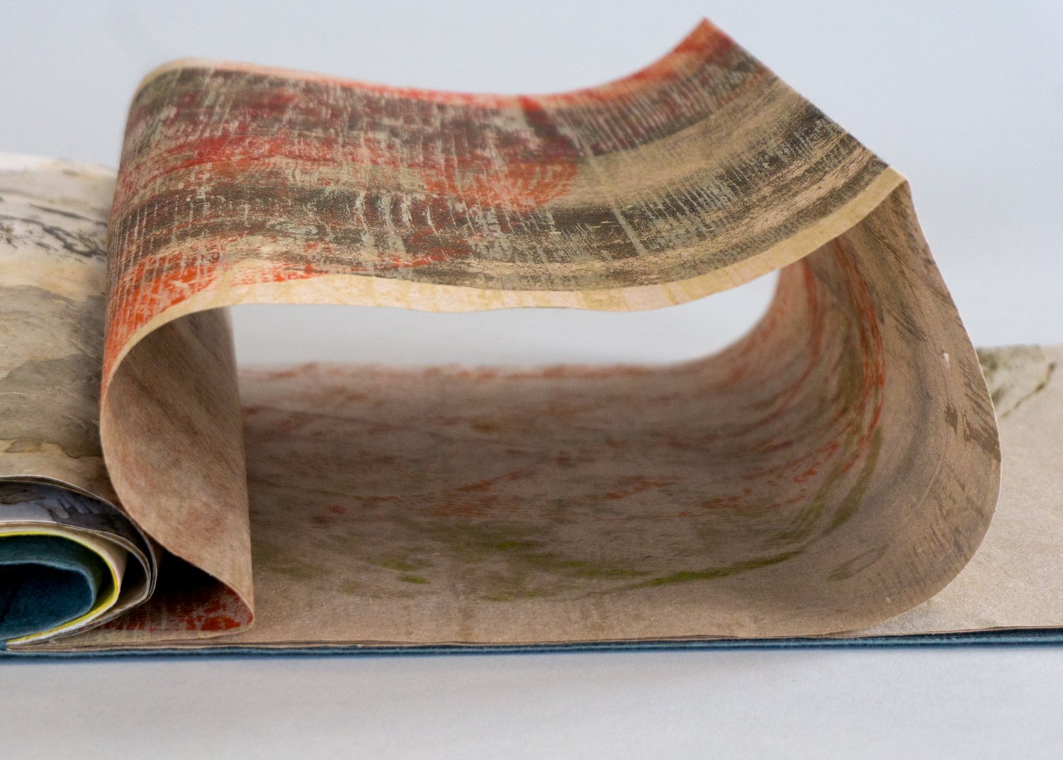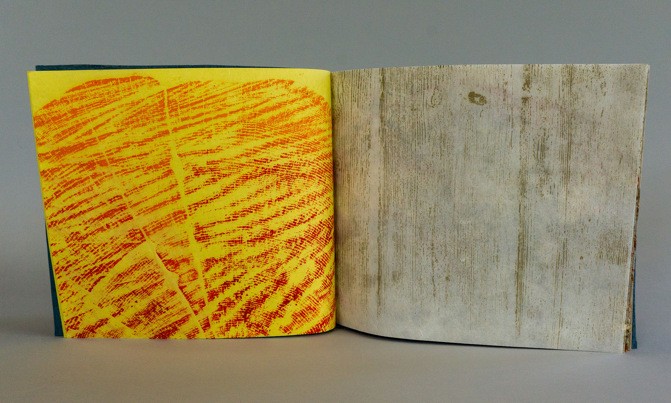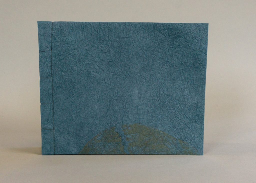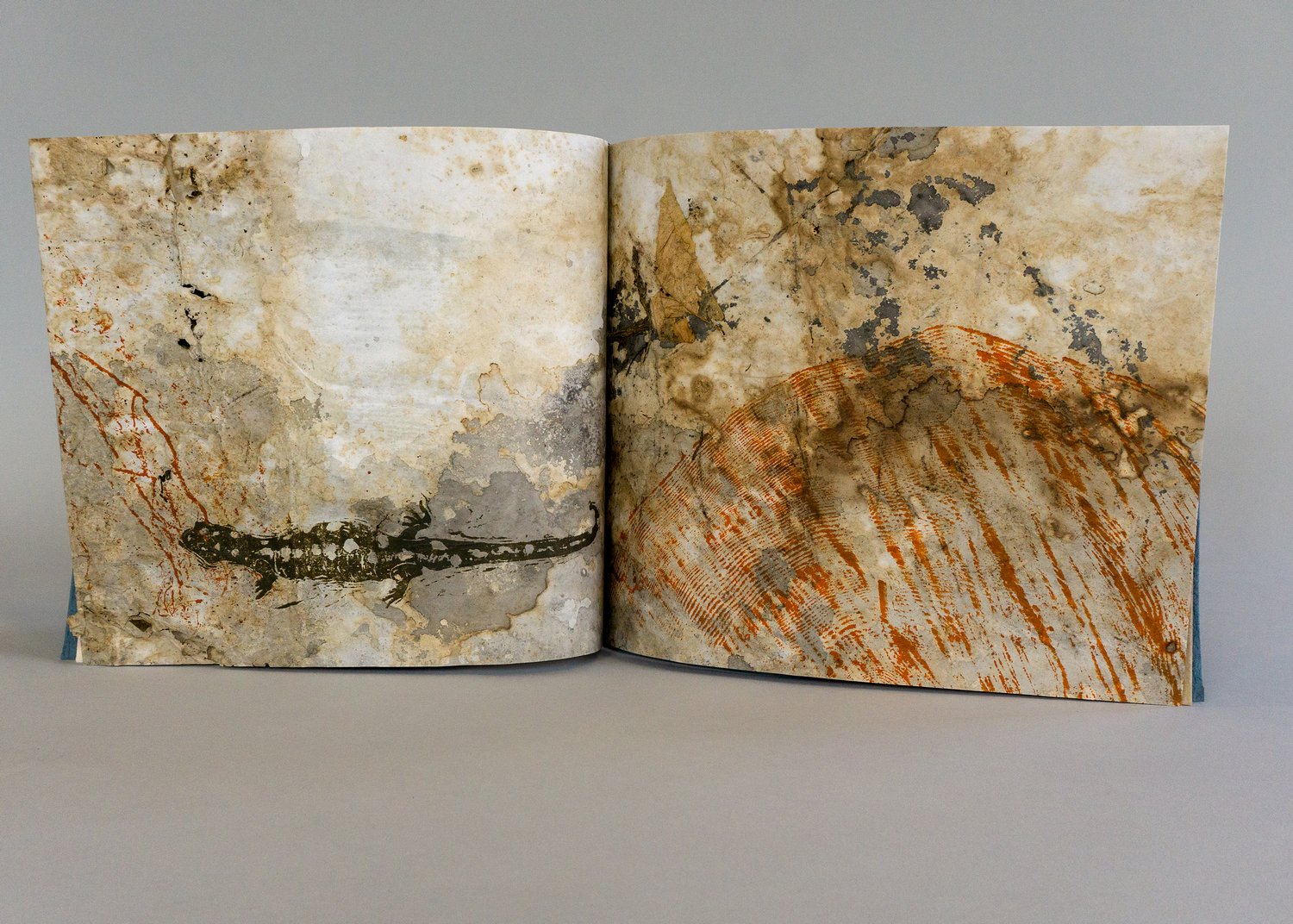Stab sewn structure, woodcut, nature print, ink gall ink, decayed paper