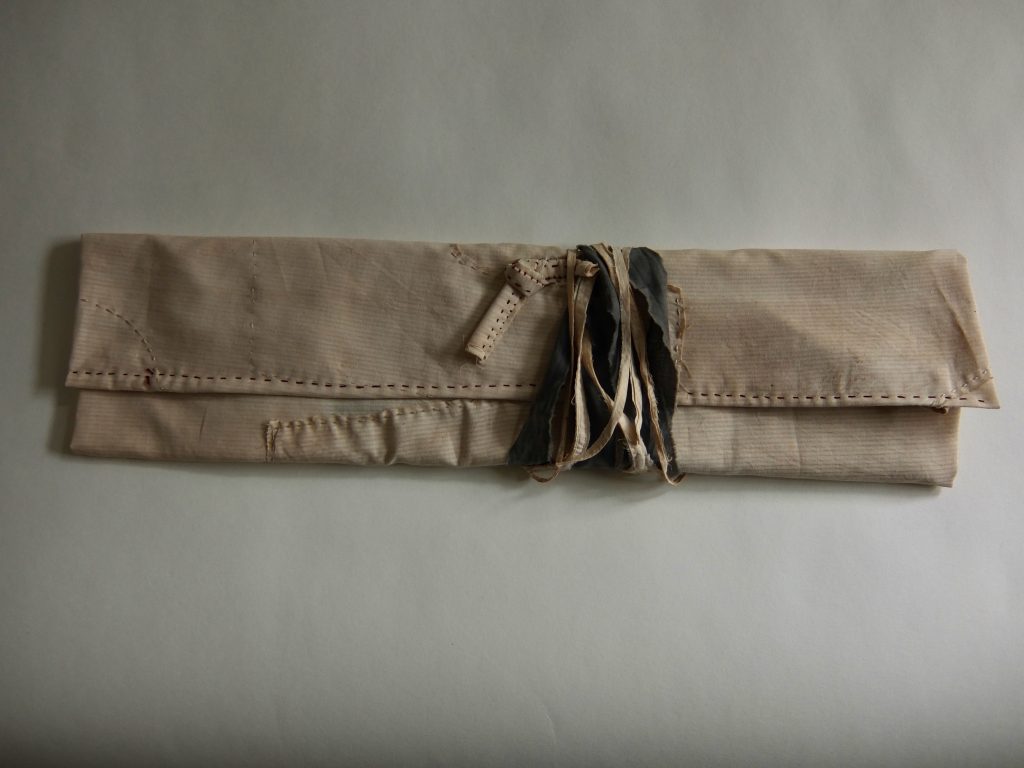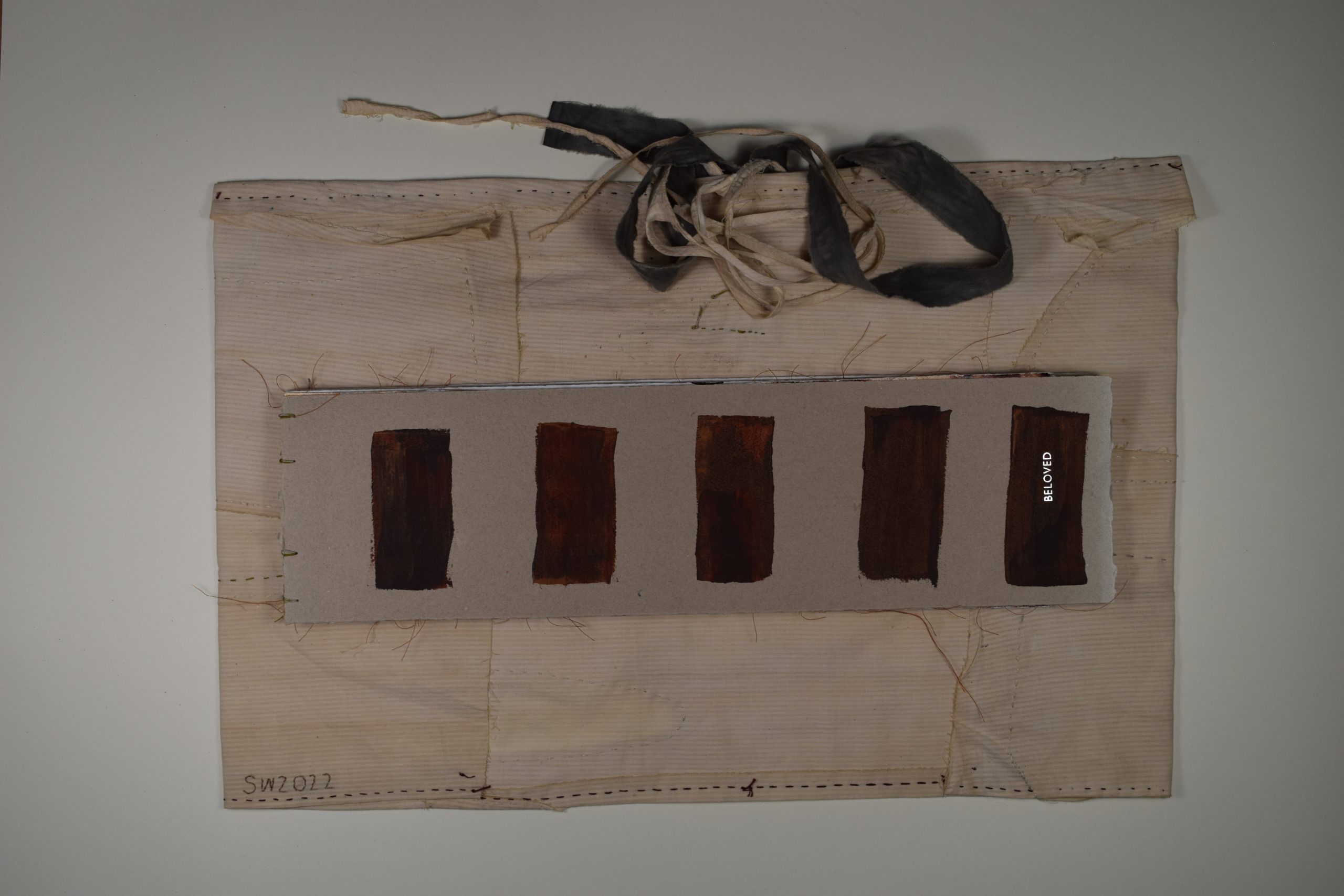 The cover needed to be something other than a hard surface. I have recently been experimenting with natural dyes. I had collected oak acorns and had made a potion. Among a collection of other fibers I also soaked the shirt my Dad had worn to his wedding. The book cover to TAKEN is a shroud. A shroud stitched from this formal shirt of my Dad who passed away in 1994.