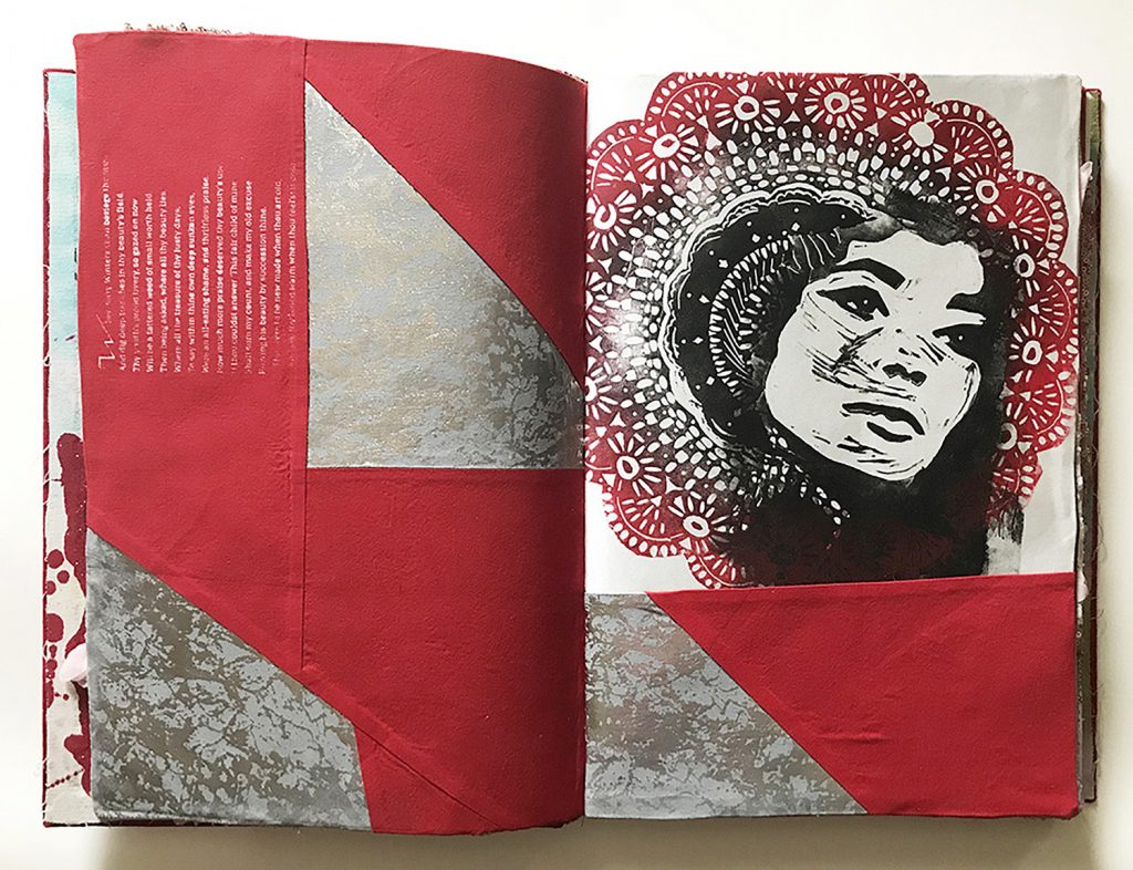The carefully screen printed sonnets gain additional layers of meaning on the book pages. The text is complemented by my linocut prints and screen prints. The pages move from one voice to many, offering multiple readings to a wide range of audiences.