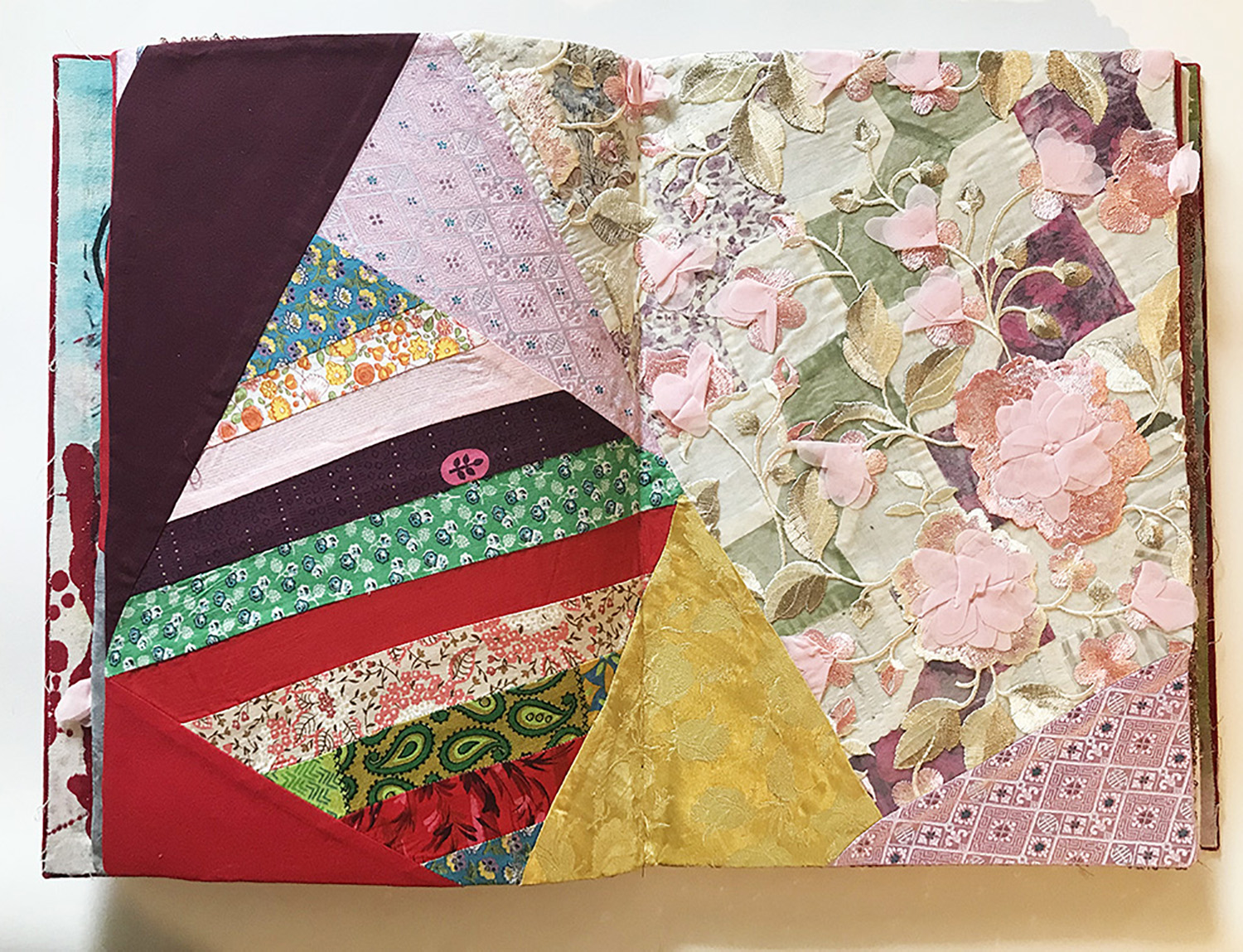The artistic style of the work can be described as deconstructionist couture. The fabric of wedding dresses is cut, dyed, painted, manipulated, and collaged with other historic textiles into new patterns and designs that allow the material of the pages to speak. The final look of the pages is very clean, purposeful, and has a fit-to-measure feel. The connection to my community is emphasized through the use of traditional Baltimorean quilting, embroidery, and intricate needle work techniques.