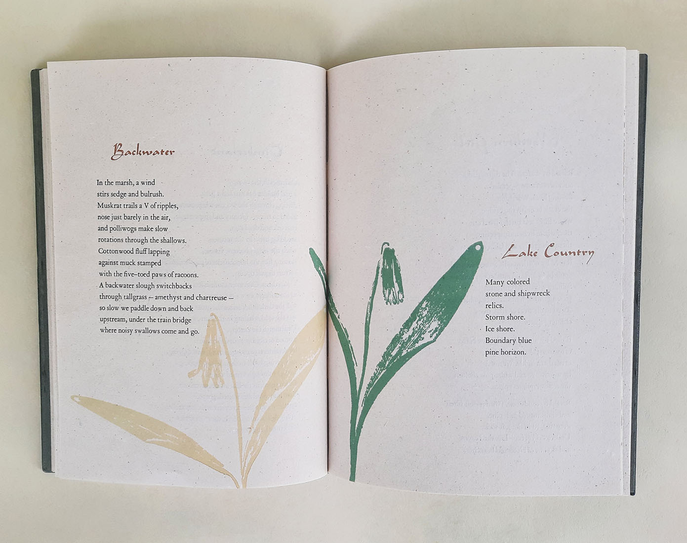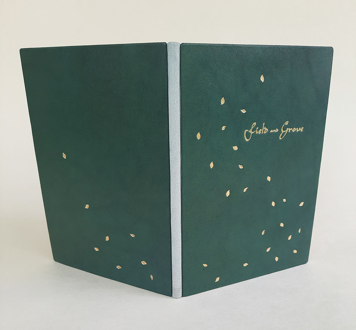 An investigation of place is central to Field & Grove, which incorporates materials and text that engage with the regional ecology of the Midwest. I sought to take the aesthetic of a poetry fine binding and push it toward an artist book through an interplay of imagery and whitespace that enhances the experience of the text. Each major element of the book holds equal weight for me artistically: the text, images, materials, and the binding.