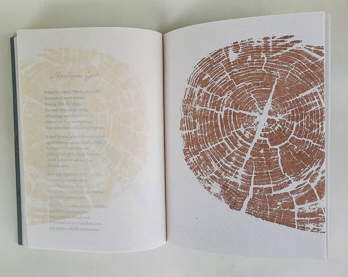 The text paper used in Field & Grove was handmade using a blend of local hemp and recycled cotton fabric. It was important for me to use fiber that was both representative of the place where it was made, and environmentally responsible. I processed the hemp fiber by hand ― from cutting down the hemp plants, to steaming, stripping and scraping the bast fibers, to beating the pulp, and finally forming the sheets. The book also contains folios of overbeaten flax paper which are transparent and printed with images that interact with both the verso and the recto of the spreads in which they appear, as seen in images 3 and 4. As a writer, text is central to my work as a book artist. I often take inspiration from the shape of a poem and the way it appears on a page when considering an image to accompany it. The incorporation of transparent sheets of paper gave me the opportunity to both to nestle an image against a poem, and to then allow the poem to stand alone by flipping the page.