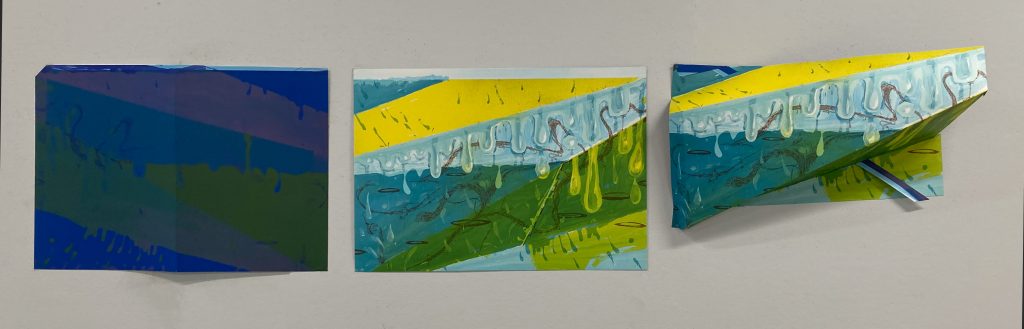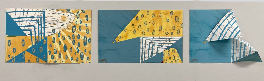 The four elements I chose were: Water as a free- owing tide, Electricity as heat energy, Crystal relating to earth and mind energy, and Plants representing all new life. This is not about new age religion or psychedelia, but rather a celebration of fantasy, and also, survival. These impulses were coupled with a parallel interest in the way a book can transform, which can then be built into a new poetic realization—one that is always changing. So in reference to the book as an idea, I planned a folio fold through the middle of each sheet, and then designed an alternative fold-out sculptural version that can be viewed as a relief wall sculpture or on a horizontal plane. In this way, each of the four elements can be viewed in four formats: book folio, relief sculpture, at side A, or at side B, making this into a multi-use, interactive, and transforming print object, like a book (see diagram above).
