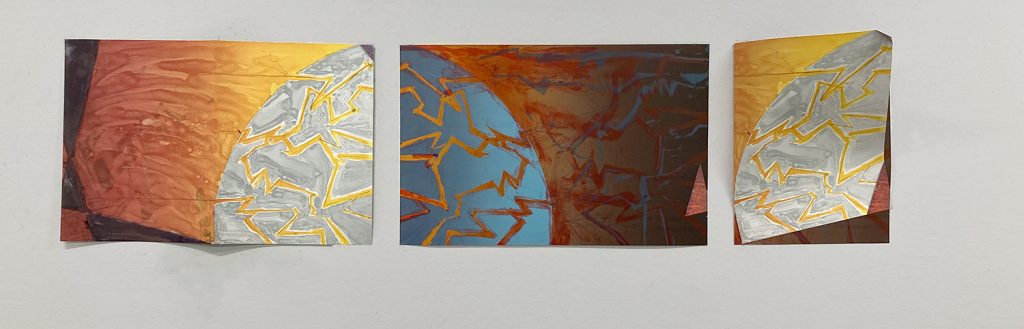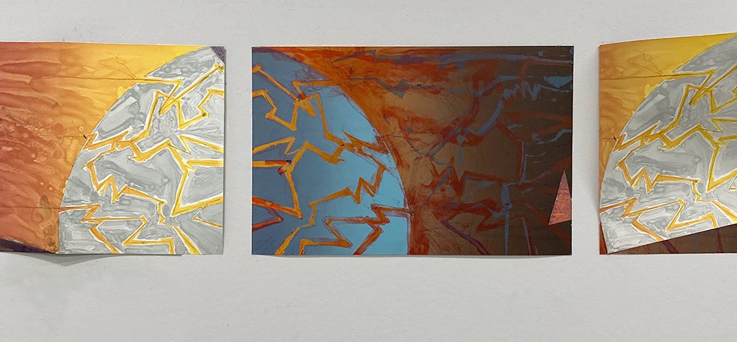 This project was initiated during the quarantines of 2020 using a newly acquired Steinmesse & Stollberg DUFA IV press. The intense atmosphere of anxiety and fear at the time, not just from the pandemic but also related to a ubiquitous rise in fascist rhetoric, compelled me to explore a metaphysical space of optimistic fantasy. Not as a retreat, but as a way of asserting humanity and beauty during what felt like a particularly hopeless time. Although I often collaborate with others on my printing projects, this one was solitary. In a sense, my only collaborator was the press itself with its many quirks and painstaking renovation. So in essence, the project documented a conversation with this historical machine. I employed a form of open-ended planning, overprinting layers of transparent colors to create the images, each responding to how the previous one had manifested on the sheet, much like working on a painting. Each of the four pieces is based on broad metaphysical themes as prompts for exploration.