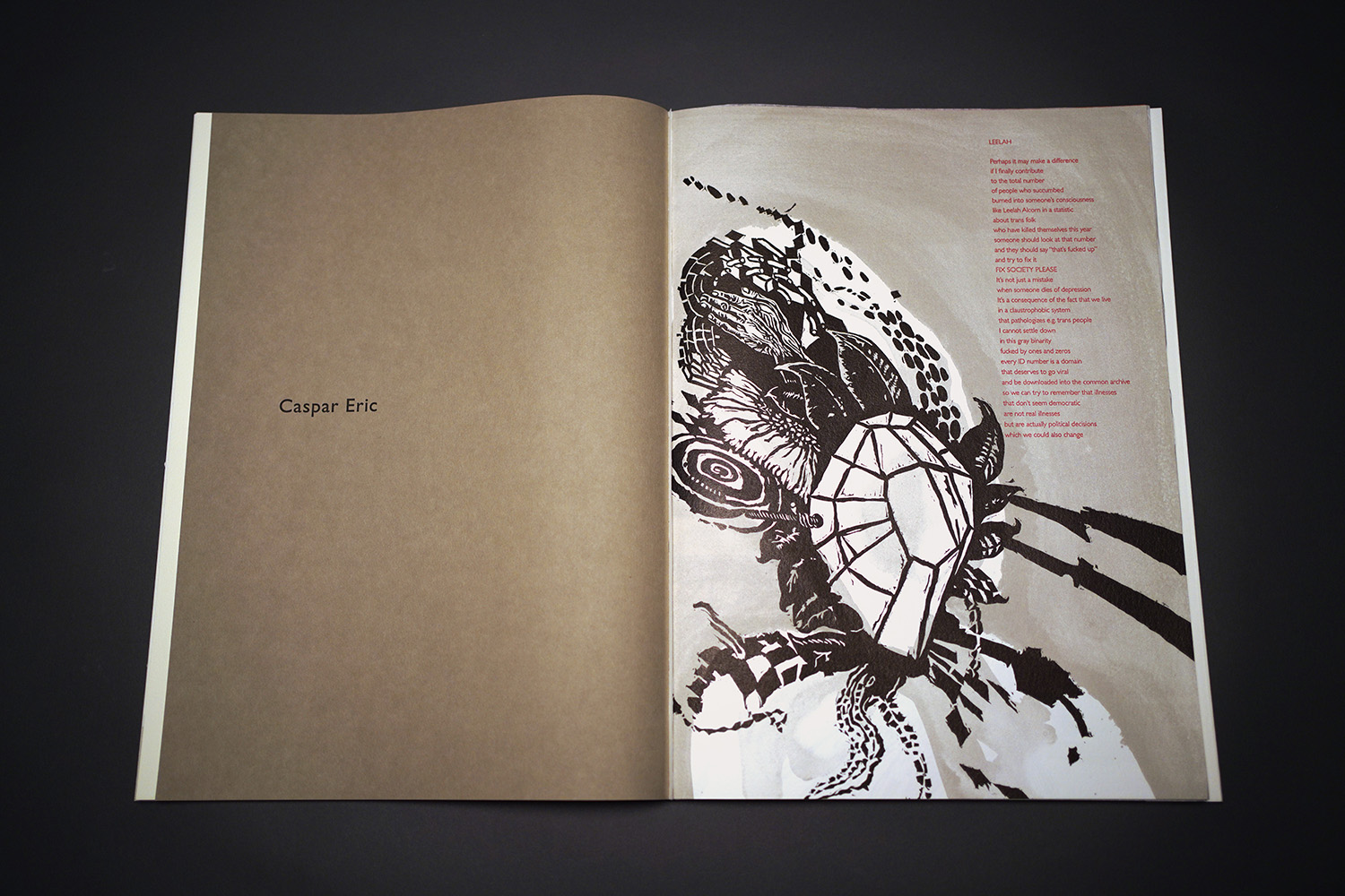The idea was to use the idea of “anthology” as a point of departure by inviting someone to either curate or gather elements that I could respond to visually and/or col- laboratively. I invited the recent Danish Drachmanns Legatet Literature Prize winner, Susanne Jorn to do this. She also happens to be a family member, so there is an added a personal aspect to the project that responds to the fact that our we are an artist family. One example that influences us all, is that my grandfather was the painter and master collaborator, Asger Jorn. She responded to the prompt by inviting six young Danish po- ets to work with me. They all agreed and I then chose to work with each poet separately on a four page section of the book. The idea was that each collaboration would be dif- ferent and demonstrate how the process of working together can allow for an emergence of an unplanned third element that goes beyond the input of the individuals involved. Each section is quite different as a result.