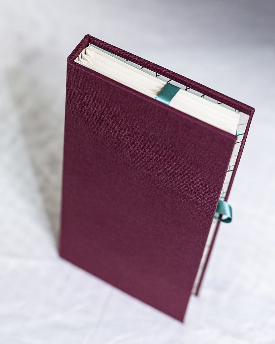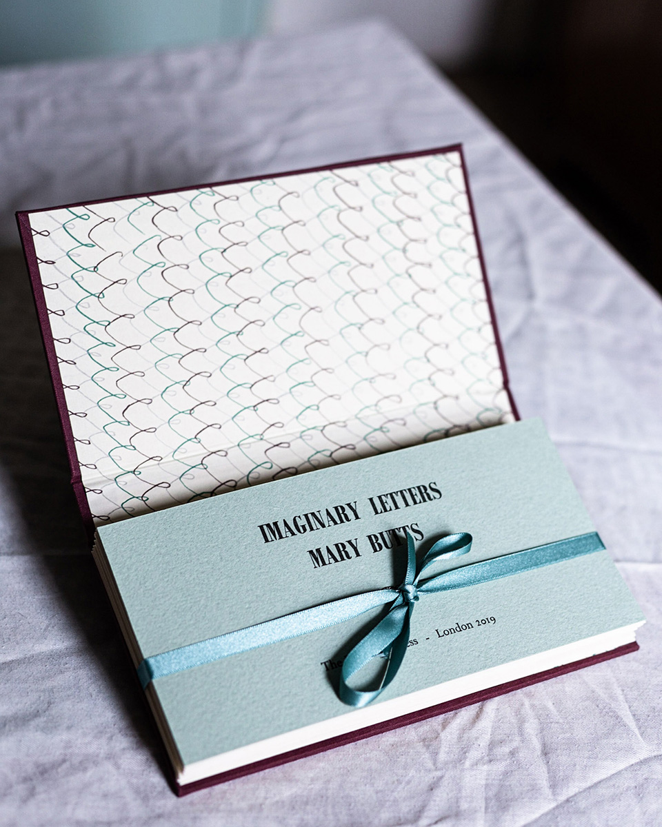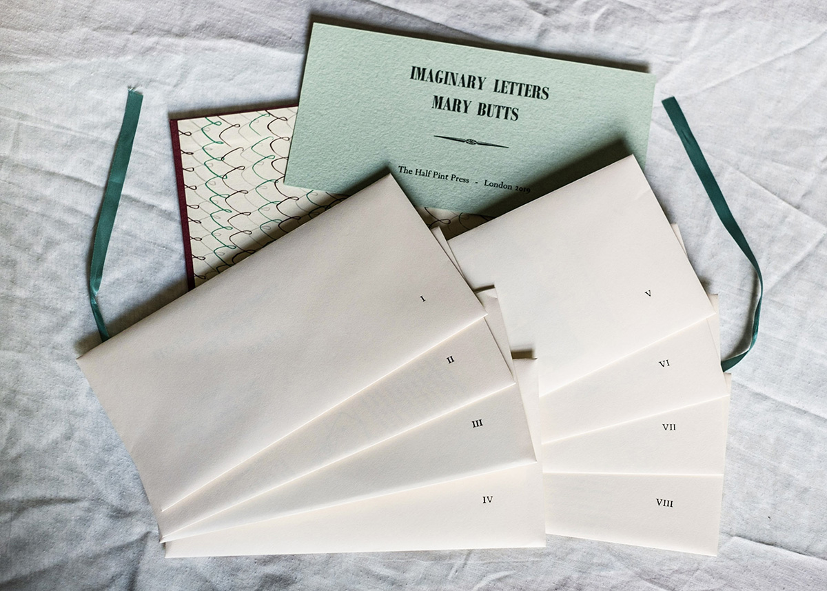 Mary Butts’s 1928 novella Imaginary Letters comprises eight letters. This edition of the novella appears at first to be a cloth-covered hardback book but once opened shows eight envelopes tied with a ribbon bound into the casing. Each envelope holds one of the letters. The envelopes are uniform but the contents are very different. The edition of 100 was typeset by hand and printed by hand by Tim Hopkins at the Half Pint Press, on an “Adana eight-five” tabletop letterpress.